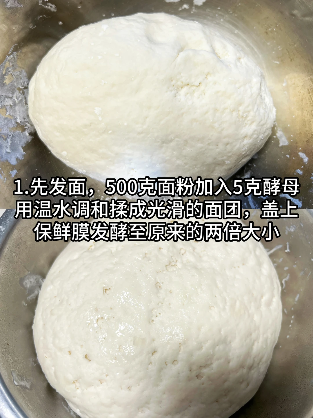 1、先发面,500克面粉加入5克酵母,用温水调和揉成光滑的面团,盖上保鲜膜发酵至原来的两倍大小