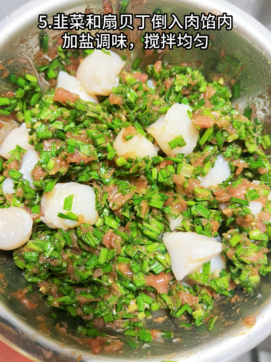 5、韭菜和扇贝丁倒入肉馅内,加盐调味,搅拌均匀