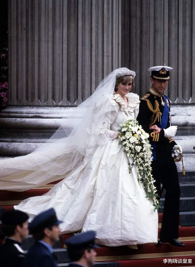 戴安娜 1981 年的婚纱,堪称史上最著名的婚纱,是 80 年代风格的缩影。礼服由大卫・伊曼纽尔与伊丽莎白・伊曼纽尔夫妇设计,标志性的泡泡袖与 25 英尺(约 7.6 米)长的裙摆创下纪录,更以 10000 颗珍珠母贝亮片与珍珠手工点缀而闻名。搭配闪耀的王冠,戴安娜宛如迪士尼公主。