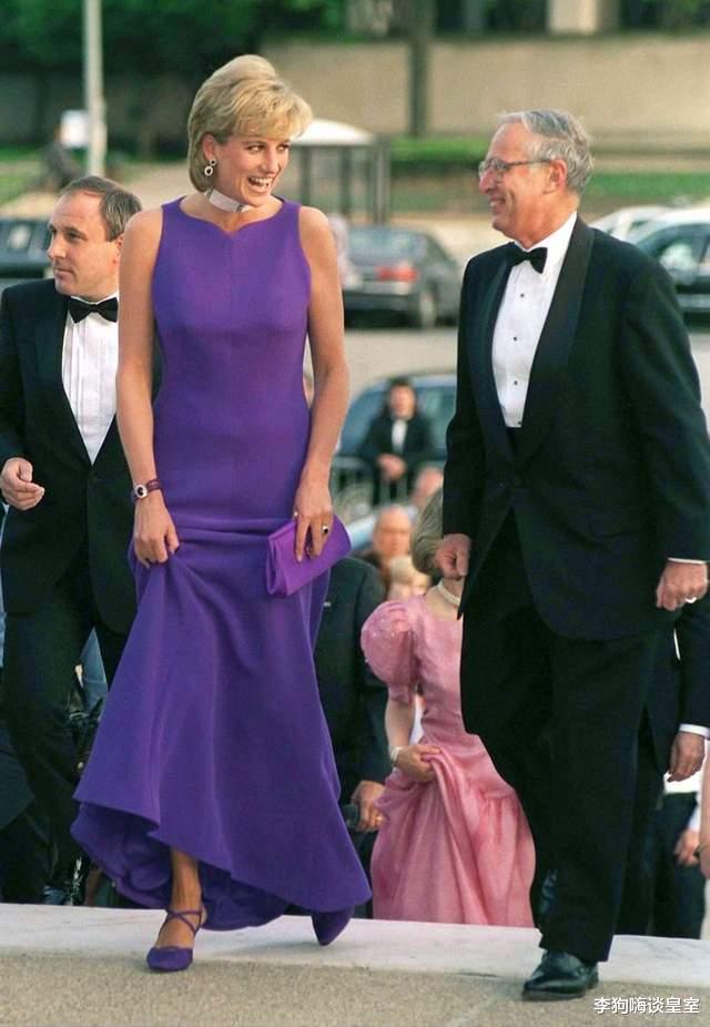 1996 年,戴安娜在芝加哥菲尔德自然历史博物馆的慈善晚宴上,身着范思哲设计的宝石色调紫色礼服,搭配周仰杰高跟鞋与珍贵的珍珠短项链,惊艳全场。这一色调既优雅又不失现代感,堪称经典。