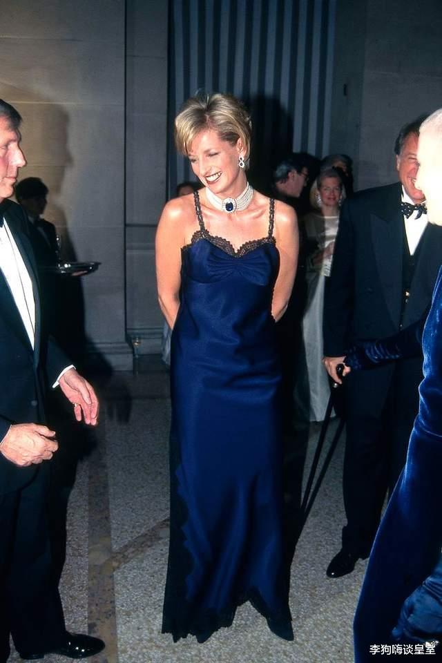 1996 年,戴安娜踏上大都会艺术博物馆慈善舞会的知名台阶,惊艳全场。她身着的午夜蓝缎面吊带裙,被不少人形容为 “成熟优雅风”,由约翰・加里亚诺为迪奥设计,灵感源自内衣款式,美得令人窒息。她还搭配了同系列的 Lady Dior 手袋,以及私人珠宝盒中的璀璨首饰 —— 包括著名的珍珠蓝宝石短项链,完美诠释了前卫时尚感。