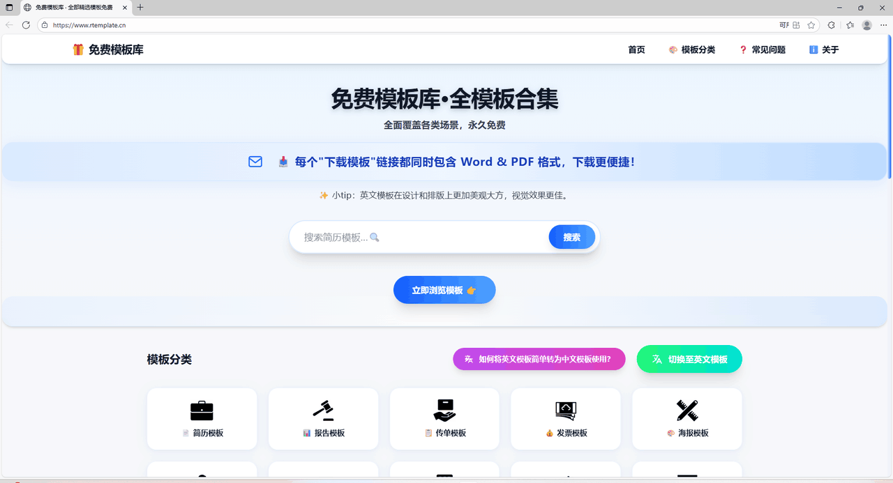 四、免费模板库这是一个完全免费且覆盖全场景模板的神奇网站。网站提供中英文双语模板,并宣称永久免费。