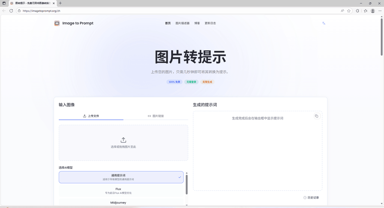 这是一个完全免费的图片转提示词生成器。它能够精准识别图片内容,一键生成高质量描述。操作非常简单:只需上传图片或输入图片 URL,选择描述目的后点击“生成”,稍等片刻即可自动生成精准描述图片的提示词。
