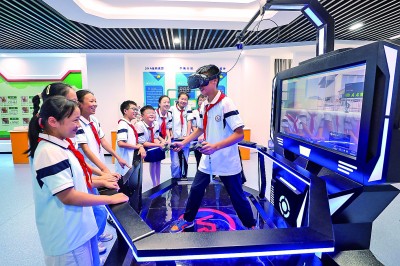 江苏省泰州市姜堰区淮海小学学生在校园科技馆体验VR项目。新华社发