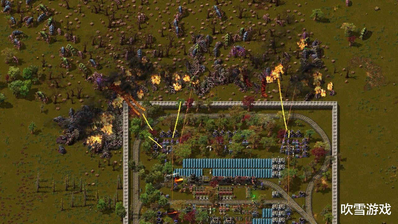 而当你的工厂初具规模,游戏会引入真正的挑战:外星虫族。你的工厂会产生污染,污染会激怒虫群,它们会定期向你发起攻击。于是你被迫发展军事科技,从简单的机枪塔到火焰喷射器,再到可以搭载核弹的坦克。生存压力不再是背景板,而是推动你继续扩张、继续研发的切实动力。