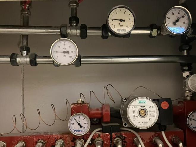 最后再给大家介绍一下一个简单的测量方法,就是找一个接触式的温度计,放在进出水管的表面,就可以测出供回水的温度了。当然了,现在也有更先进的测温枪,对着供水管和回水管分别测一下,就测出了供回水的温度。