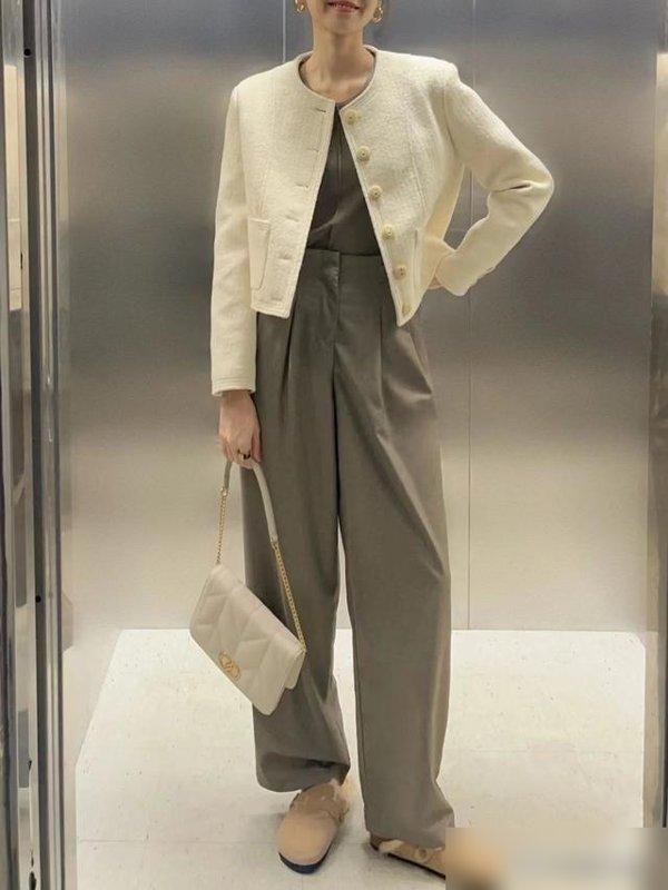 还有面料选择,想走休闲风就选牛仔阔腿裤,磨白的牛仔布和小香风的粗花呢撞在一起,反差感贼时髦;要通勤就选西装阔腿裤,垂坠感拉满,走路带风,同事都问她是不是偷偷买了香奈儿套装,其实那套才几百块!