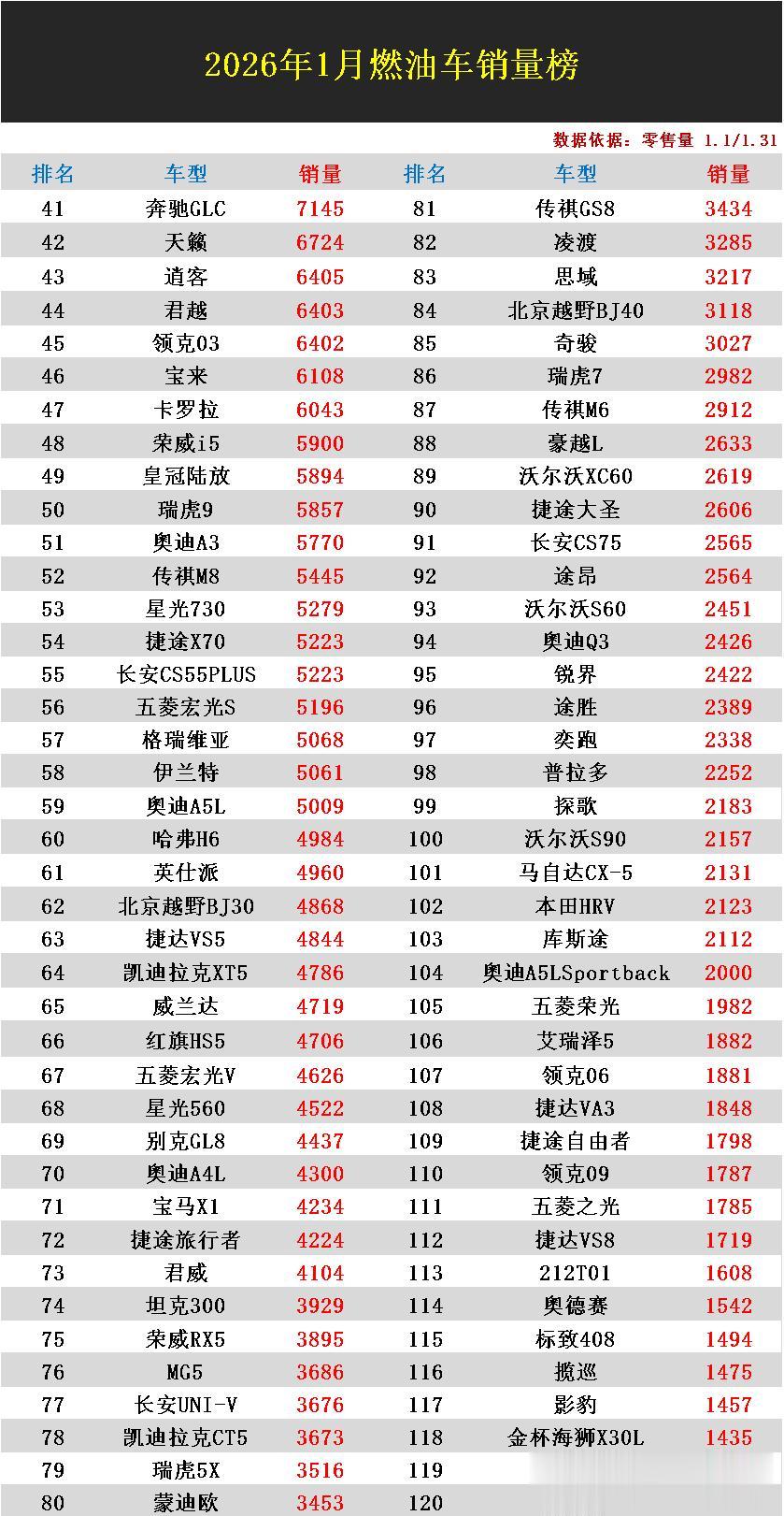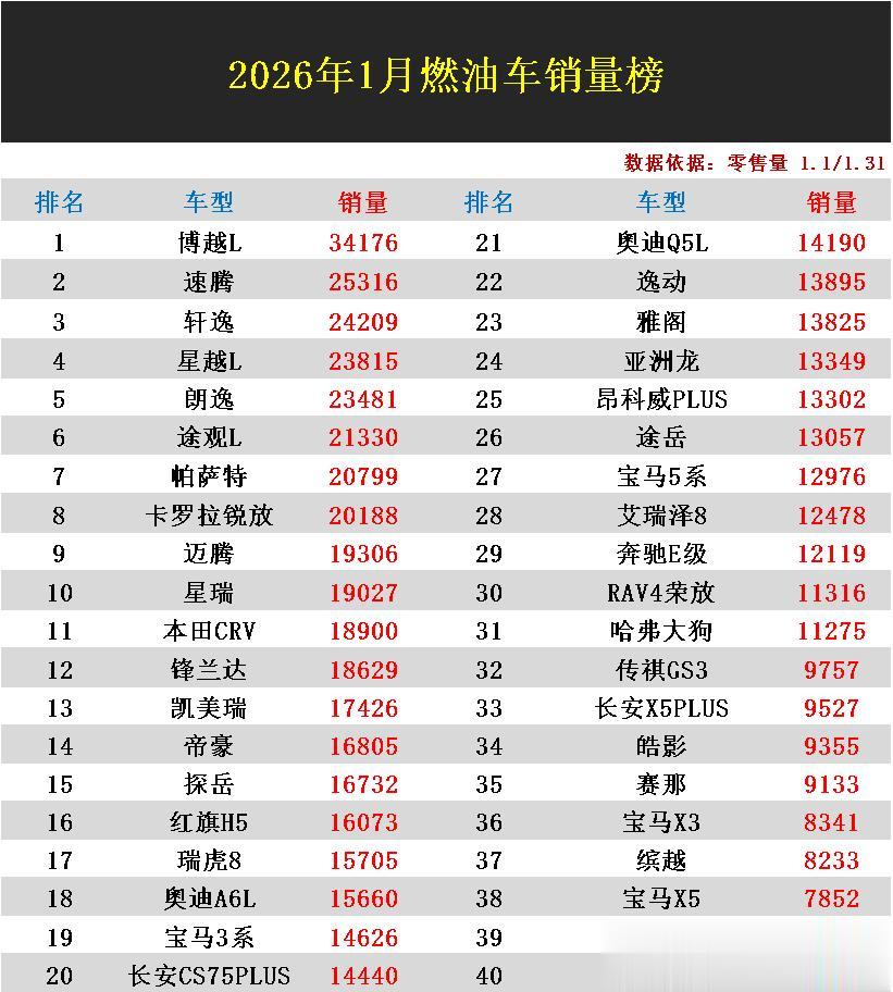 导读:看了乘联会方面最新公布的1月燃油车的销量排行榜,给人的第一直觉就是,这一细分市场的销量就是稳当,在新能源强势崛起的当下,仍然有着超过31款车型月销量超过万辆,而在榜单前120名里面各车型销量均实现破千。其中自主品牌吉利表现最为亮眼,旗下的博越L和星越L两者携手卖出了5.8万辆,成功领跑燃油车市场。大众速腾、朗逸、途观L、帕萨特组成的德系阵营也都各自售出了20799辆以上的佳绩。日系品牌的日产轩逸、丰田卡罗拉锐放、本田CRV、丰田凯美瑞等经典车型也都守住了各自的销量份额,排名继续稳居榜单头部阵营。从整体格局来看,燃油车市场虽然受到新能源爆发的持续冲击,但它们依然凭借良好的市场口碑,无续航焦虑等诸多优势,基本盘依旧扎实。1月燃油车销量战报:31款破万,博越L登顶,轩逸第3,哈弗H6第60