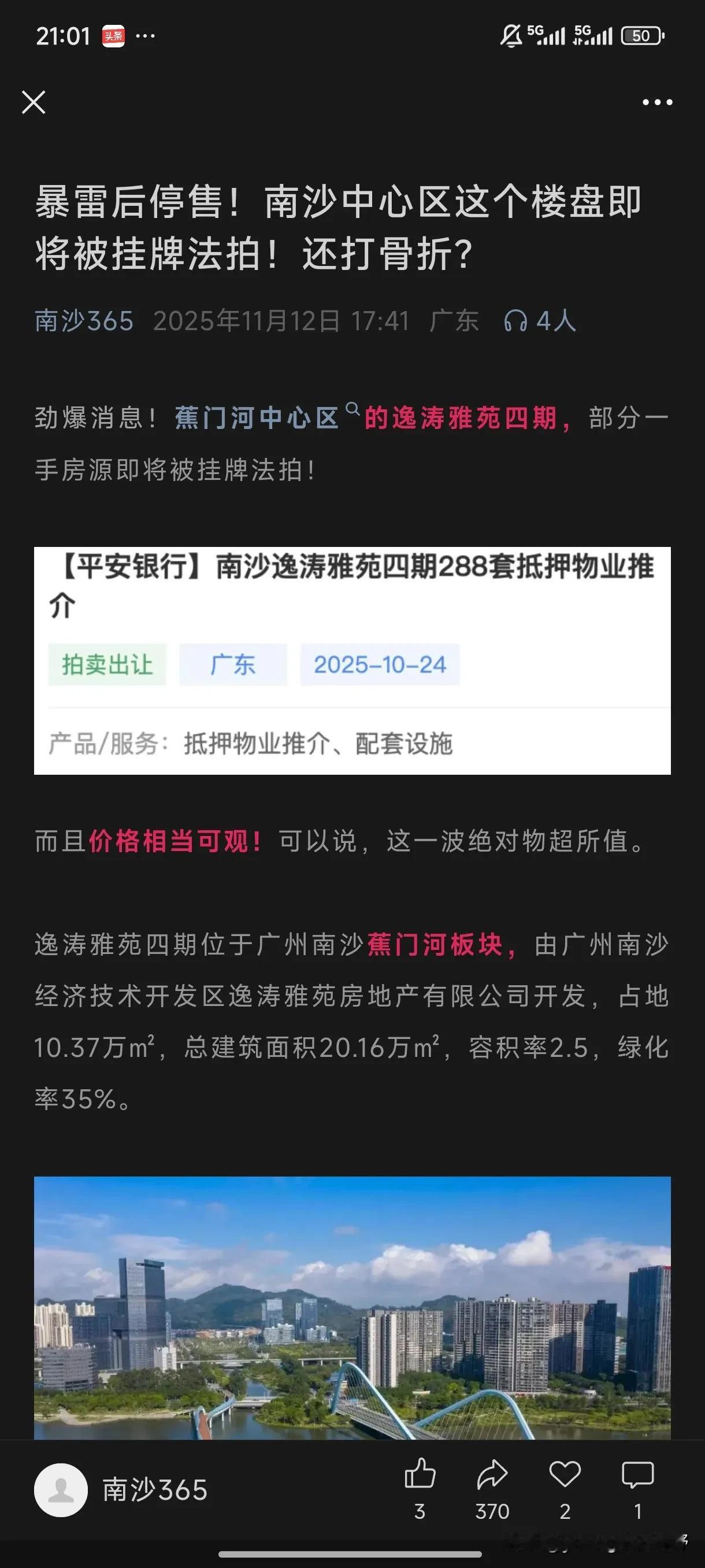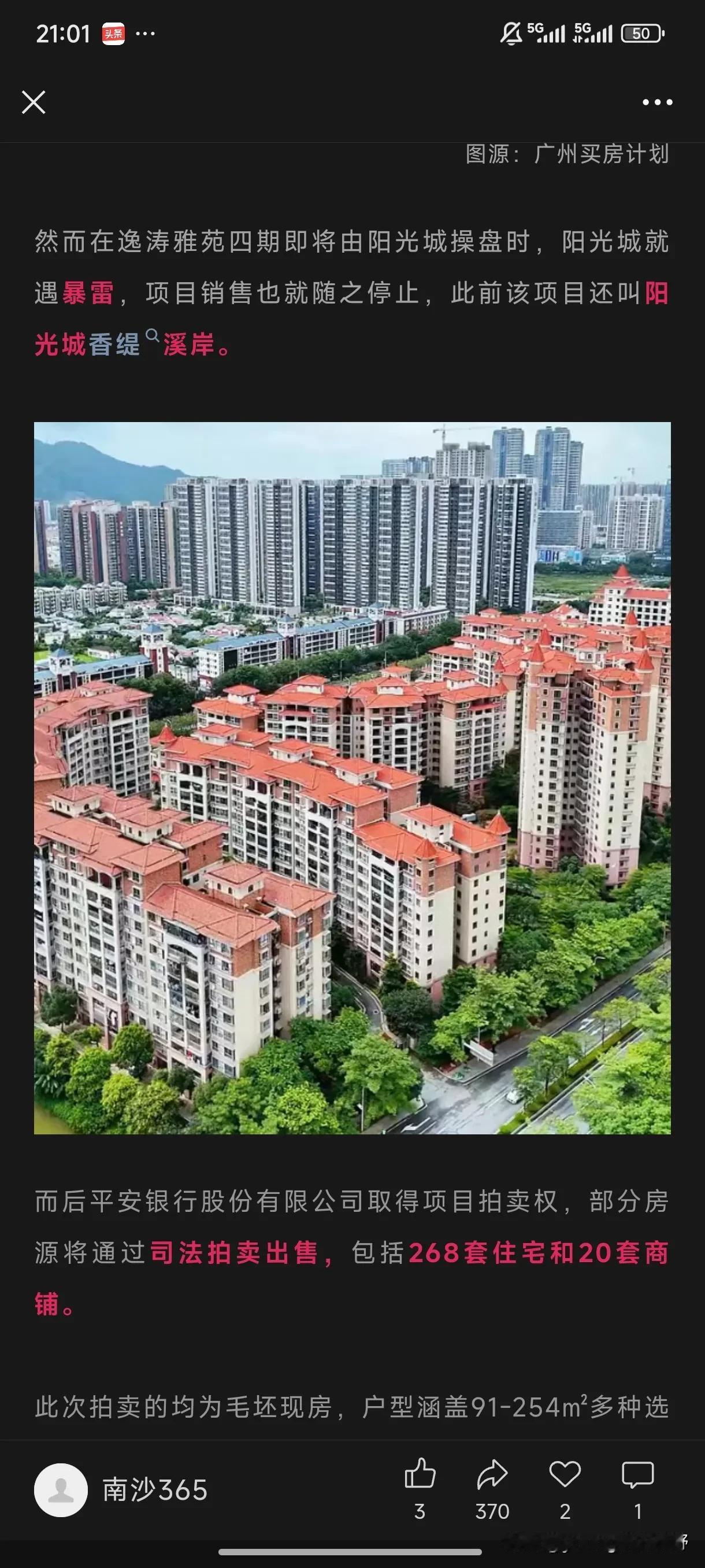 位于广州南沙蕉门河旁的逸涛雅苑小区,有两栋楼一直没什么人居住。之前还觉得挺好奇的,直到看见公众号上发布的这则消息,才知道原来这个楼盘面临法拍。之前承接的开发商操盘时遭遇爆雷,所以销售的项目停止了。根据披露的消息,起拍价格貌似还挺便宜的,不到1万块钱一方。并且由于是未销售的楼房,相对来说应该会少很多后续的麻烦。所以这种法拍房性价比应该很高吧?