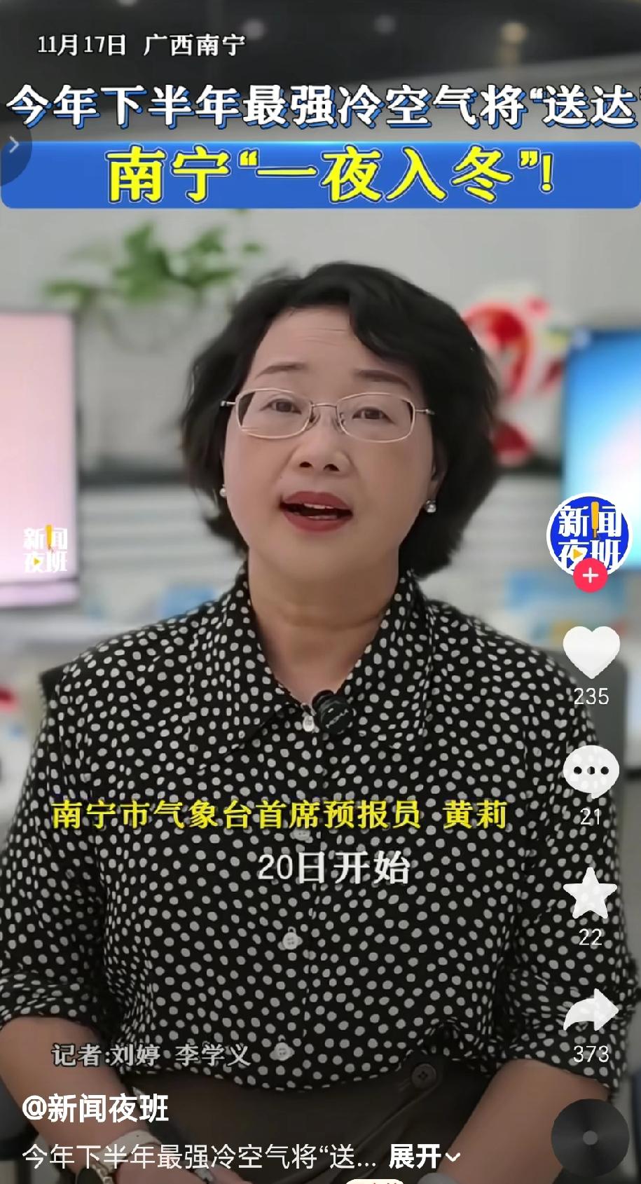 10月17号广西气象台预计,今年最强冷空气可能会在今晚夜间来袭,南宁可能一夜入冬,在冷空气来临的时候,大家确实要注意防寒保暖,及时增添衣物,尤其是老人和孩子,要特别注意头部、手部和脚部的保暖,避免感冒哦。(来源于@新闻夜班)