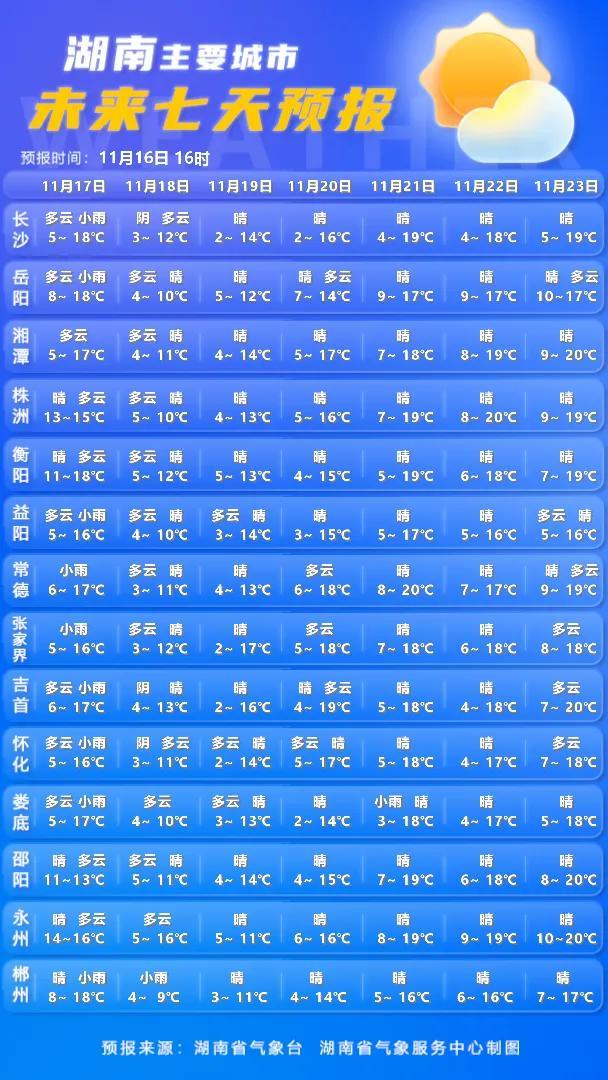 17日晚上至18日白天,永州、郴州南部多云到阴天有小雨,其他地区阴天到多云;北风4~6级,局地阵风7~9级;最低气温湘南5~7℃,其他地区2~4℃;最高气温9~13℃。