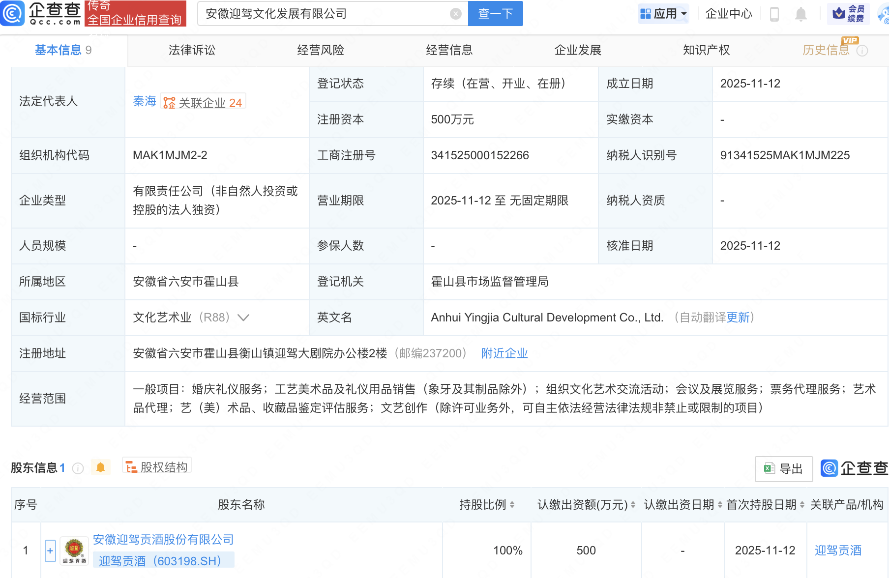 企查查APP显示,近日,安徽迎驾文化发展有限公司成立,经营范围包含:组织文化艺术交流活动;会议及展览服务;票务代理服务等。企查查股权穿透显示,该公司由迎驾贡酒(603198)全资持股。