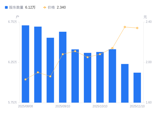 近一年(2024年12月31日至2025年11月10日),普邦股份A股股东户数从7.53万户,减低至6.12万户,降幅18.69%,区间股价上涨15.27%。