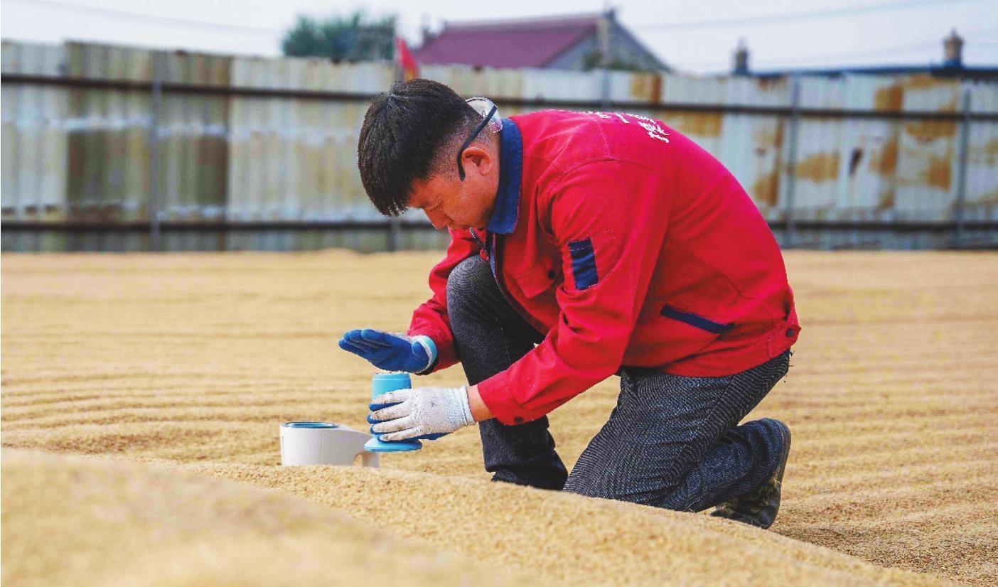 刘洪刚在测量稻谷的水分,为安全归仓做准备。本报记者严佩鑫摄