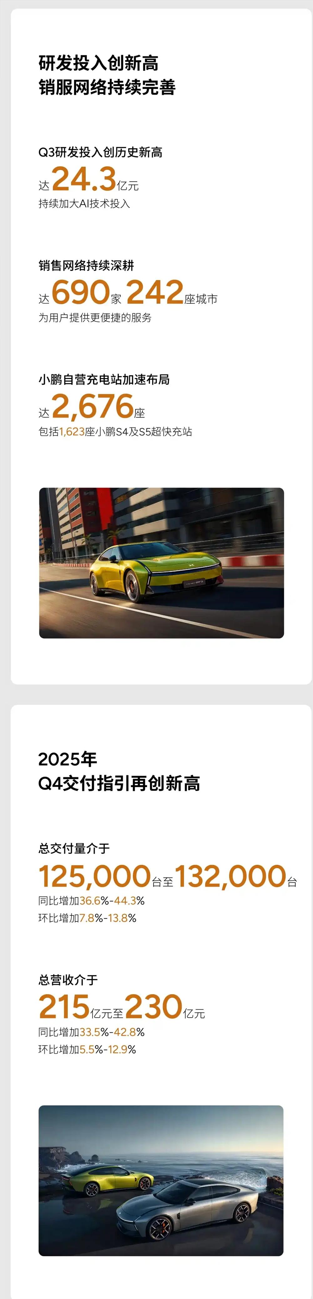 小鹏汽车Q3财报炸了![666] 销量利润双丰收,这波是真的支棱起来了! ▸ 季度交付量:116007台。同比+149.3%(近1.5倍),环比+12.4% ,这增长率简直了 ▸ 季度营收:203.8亿元。同比+101.8%,环比+11.5% ▸ 毛利率:20.1%。同比提升4.8个百分点,环比提升2.8个百分点,毛利率突破20%,意味着小鹏每卖一辆车,能赚的钱更多了! ▸ 现金储备:483.3亿元。钱包鼓鼓,研发和扩张底气十足。 ▸ 研发投入:24.3亿元,持续砸钱搞技术。 ▸ 销售网络:690家/242城,自营充电站:2676座(含1623座超快充)。基建也跟上了。 ▸ Q4指引:交付12.5-13.2万台,营收215-230亿元,四季度看样子还要接着奏乐接着舞[看] 这数据,妥妥的优等生成绩单! 以前总说新势力“蔚小理”,现在小鹏这势头,怕是要重新定义江湖格局了?[吃瓜群众] 大家觉得小鹏这季度能大获成功,最大的功臣是哪款车?还是整体产品力的提升?来评论区聊聊!