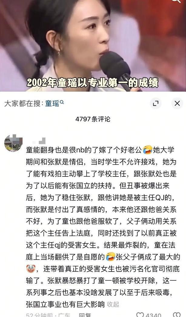 童谣真的蛮厉害的! 其①刚上大学没多久,就能俘获知名星二代张默,成为其女朋友。 如果没有后面的事情,她能搭上张国立这个人脉资源,毕业后也是可以少走许多弯路。 其②上戏有规定,大一大二不能出去拍戏。 童谣却能征得系主任同意,大一就出去拍电视剧,还是戏份很重的女一号。 其③大学发生这么大的丑闻事件,进圈后还能找到身家这么雄厚的老公。 在老公的助力下,成为85🌸中拿下白玉兰的第一人。 其④结婚这么多年,老公也没有逼她生孩子,而是一心一意助力她的演艺事业。 甚至她的老公也说了,不一定非要生孩子,一切尊重她的意愿。 这不就是现实中的大女主嘛! 童谣
