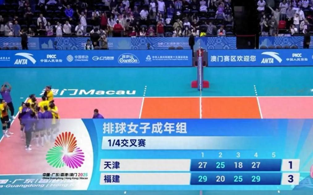 第十五届全运会女排成年组一场备受关注的1/4决赛,卫冕冠军天津女排以27-29、