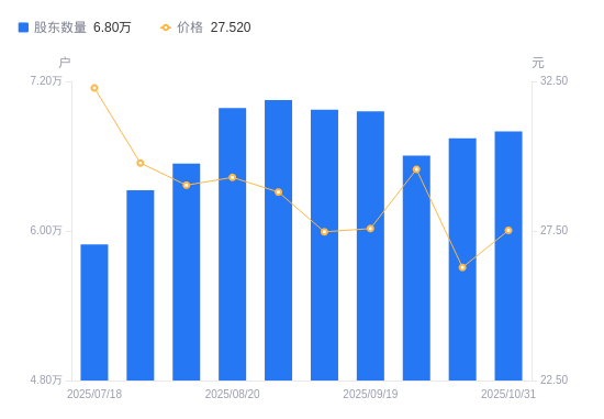 日期A股户数(户)流通A股户均持股数(股)户均持股市值(万元)2025-11-107048914292.1536.802025-10-316798214819.2140.782025-10-206742314942.0739.272025-09-306603615255.9145.102025-09-196960314474.0839.922025-09-106972214449.3839.692025-08-297049514559.9641.932025-08-206987014690.2043.032025-08-086540115694.0245.562025-07-316326616223.6348.30