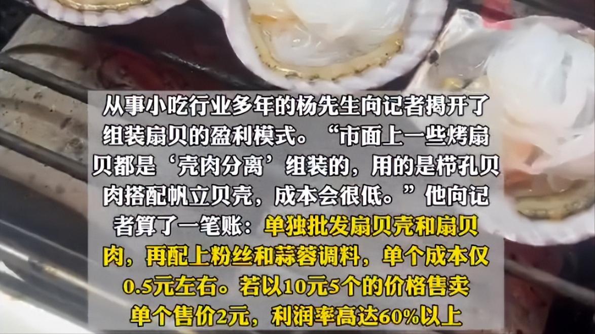 商家为了多赚钱,真的是什么方法都想得出来。 你吃的扇贝是真的吗? 看似肥美的烤扇贝,居然是“组装货”! 很多烤扇贝并不是用新鲜扇贝现烤的,而是用几分钱的贝壳和几毛钱的肉组合而成的。 再配上粉丝和调料,成本不到1块钱,卖的时候卖好几块钱一个。 这些食材的背后有很大的安全隐患。 偶尔吃点还行,可不能经常吃。 卖扇贝尽量选择大型海鲜市场、正规餐厅购买,要避免在没有资质的夜市小摊、流动摊贩处消费。