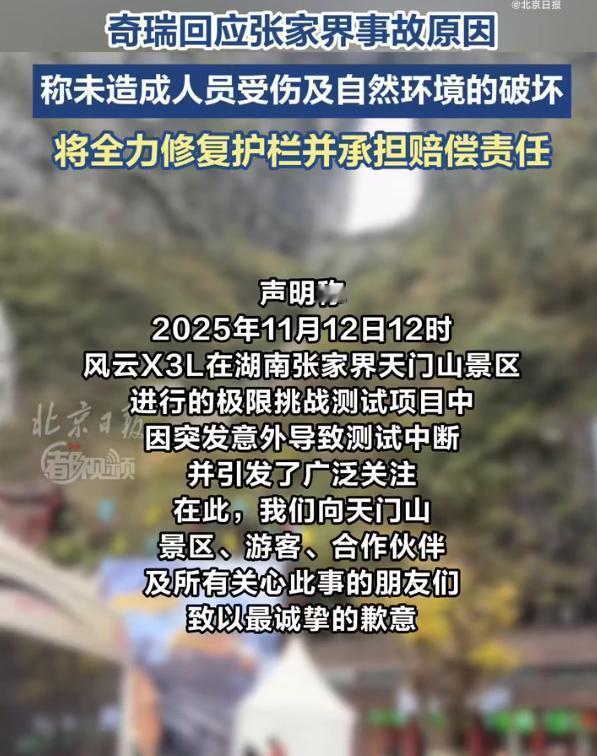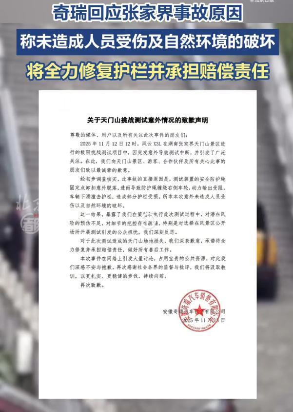 又一个汽车品牌在测试的时候“翻车”了。 这次模仿测试可以说是彻底的“失败”了! 奇瑞汽车在天门山内的“天梯”上进行爬台阶极限挑战测试,结果车从台阶上溜下来了,还撞坏了景区护栏。 事后奇瑞品牌公开道歉,并且承诺会修复赔偿天门山的护栏。 这种实验主要是考验车辆的动力、轮胎抓地力、接近角和离去角。 奇瑞敢做这种无法作假的测试,也是挺实在的。 既然是挑战就有失败的风险,这个护栏不是2003年修建的,是为了大家上下山方便。 现在奇瑞已经诚心道歉了,之后只要给修好就没有什么大问题。