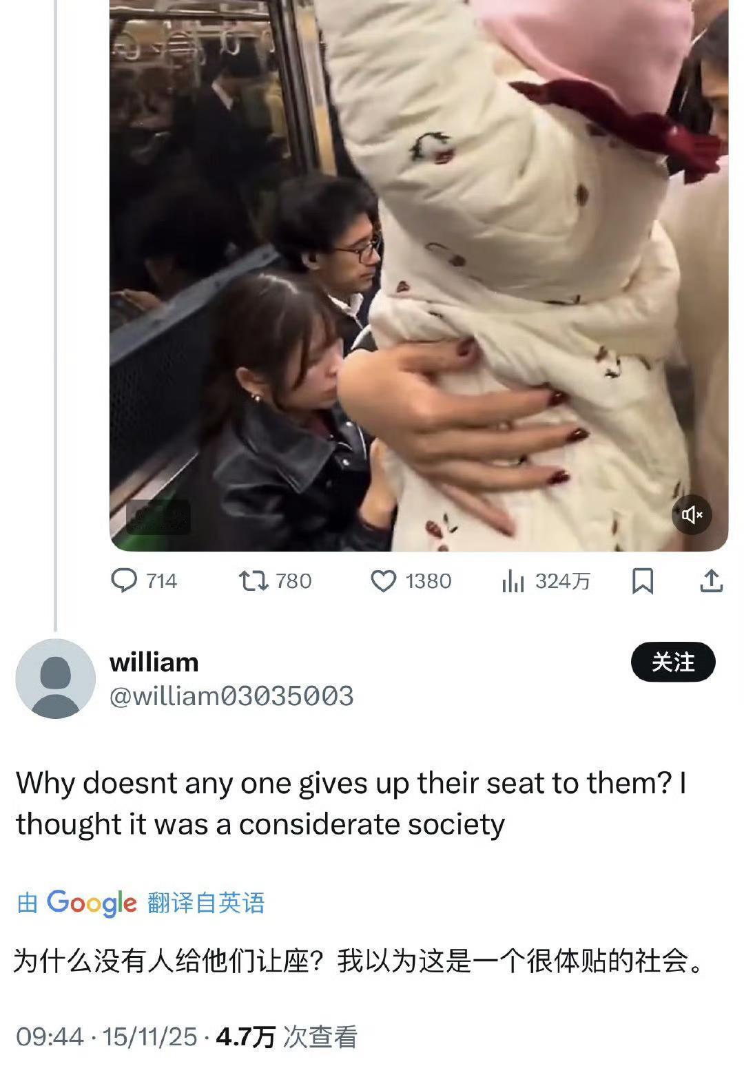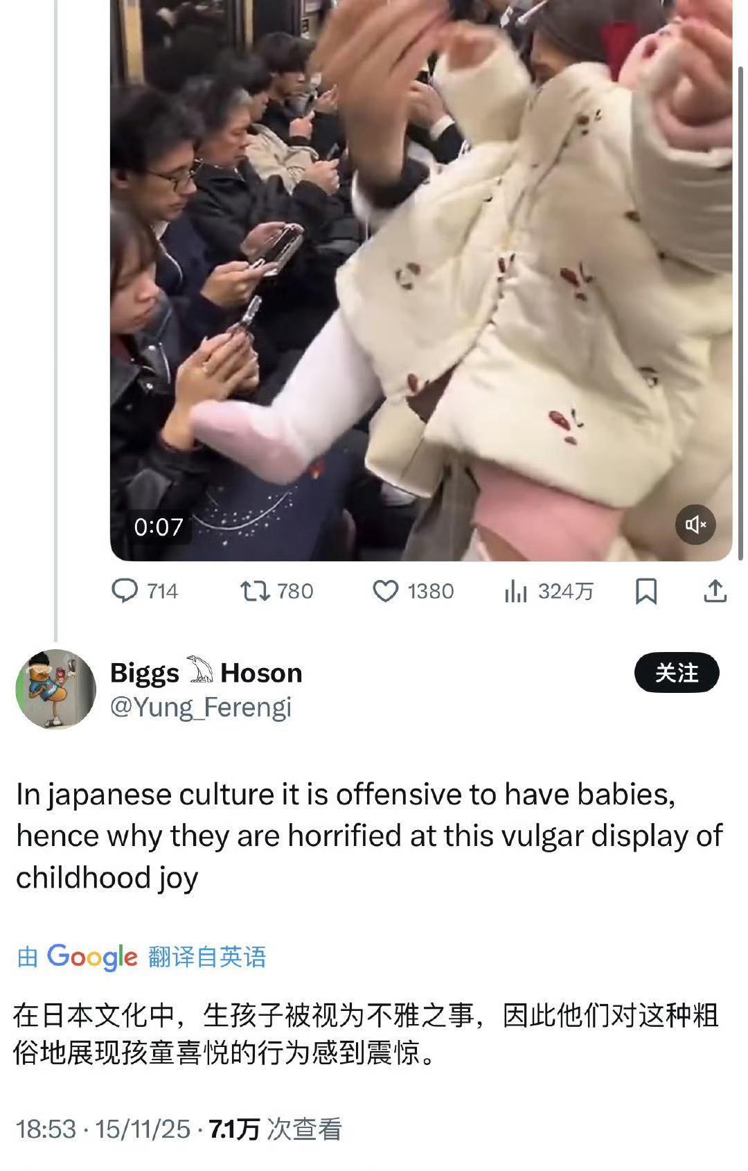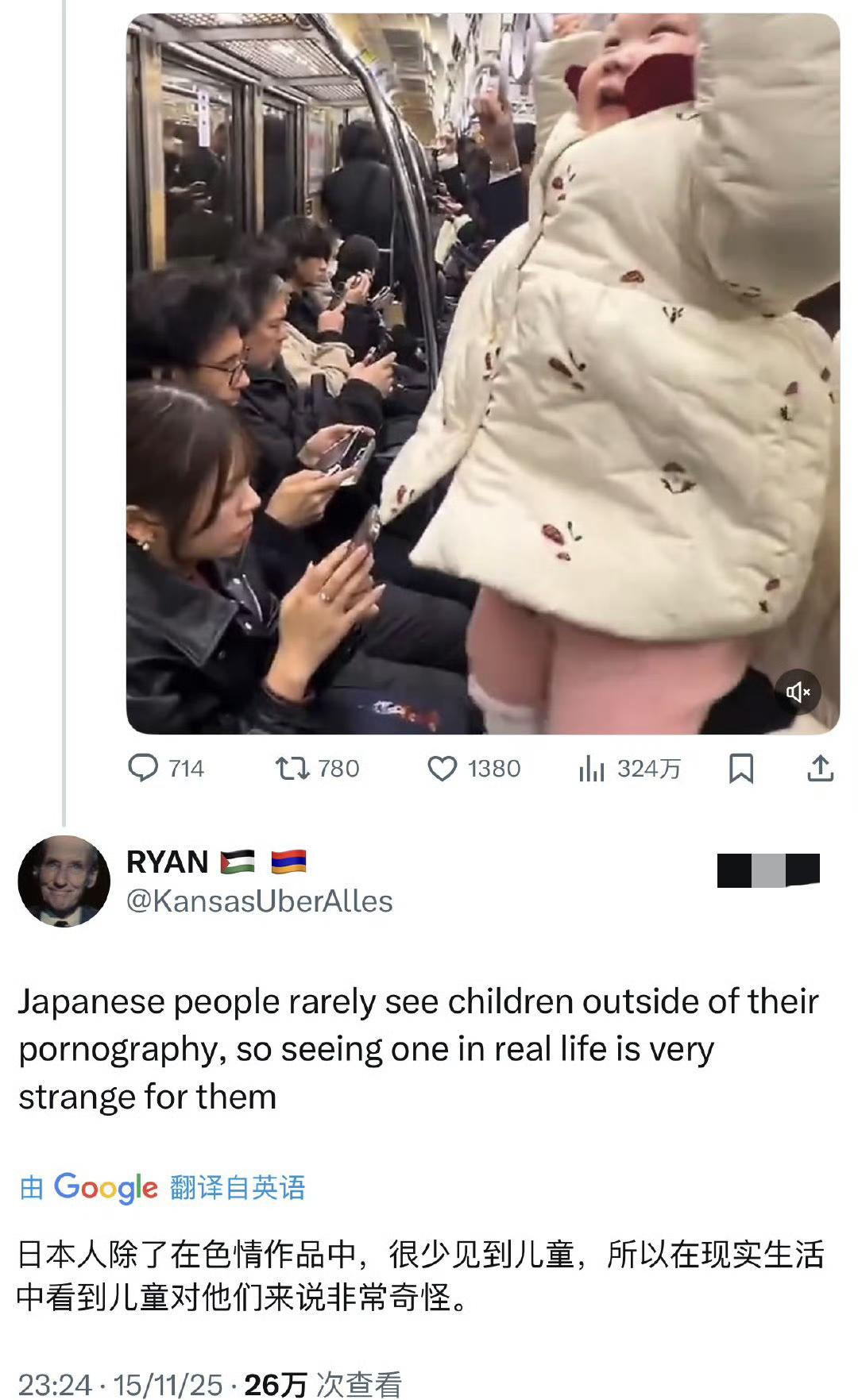 日本人不让座还网暴中国游客和婴儿,把婴儿照片po 到网上并配文“中国人在日本地铁的迷惑行为”想要让网友网暴婴儿,没想到很多海外网友纷纷谴责日本人不让座和厌童,一个婴儿在地铁里面笑也不行?如果没有婴儿你们国家很快就要灭亡了,到最后只剩下非洲和印度人
