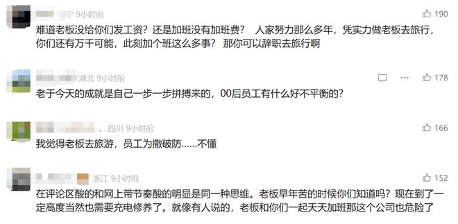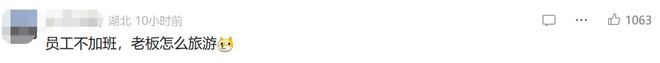 还有一种声音,比较有讽刺意味。点赞最多的一条评论是“员工不加班,老板怎么旅游”。
