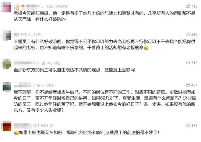 对于此事,网友们也是议论纷纷,有替俞敏洪说话的,认为“老板今天能在南极,是曾经艰苦创业得来,没什么好破防”;有人对比其它公司,表示“至少新东方的员工可以自由表达不共情的观点,还能发上互联网”;还有人替俞敏洪喊苦,“员工说俞敏洪‘不共情’,可反过来想,员工也未必能共情老板的难。俞敏洪当年把快倒闭的新东方拉回来,‘双减’时自己扛着压力,现在砸钱做文旅、保东方甄选,这些压力员工没经历过。