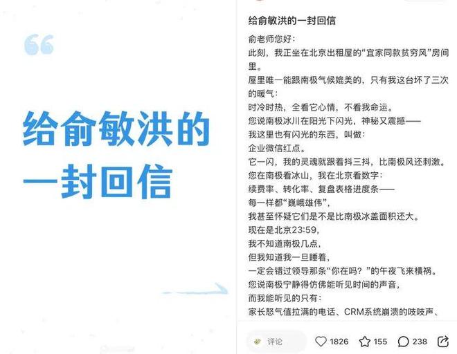 信中没有宏大的词汇,取而代之的是一线员工的日常工作细节。“您在南极看冰山,我在北京看数字:续费率、转化率、复盘表格进度条,”信中写道,“您那里有冰川闪光,我这里闪光的东西,叫作:企业微信红点。”