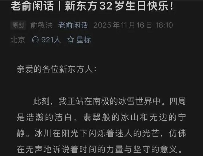 这封在南极写下的贺信,满是俞敏洪对创业历程的感悟和对工作团队的感恩。然而,这封饱含“南极感悟”的信函并未收获预期的共鸣。俞敏洪的信刚一发出,国内的新东方员工炸锅了,直接来了一场“反向庆生”。