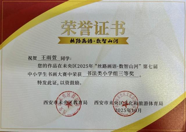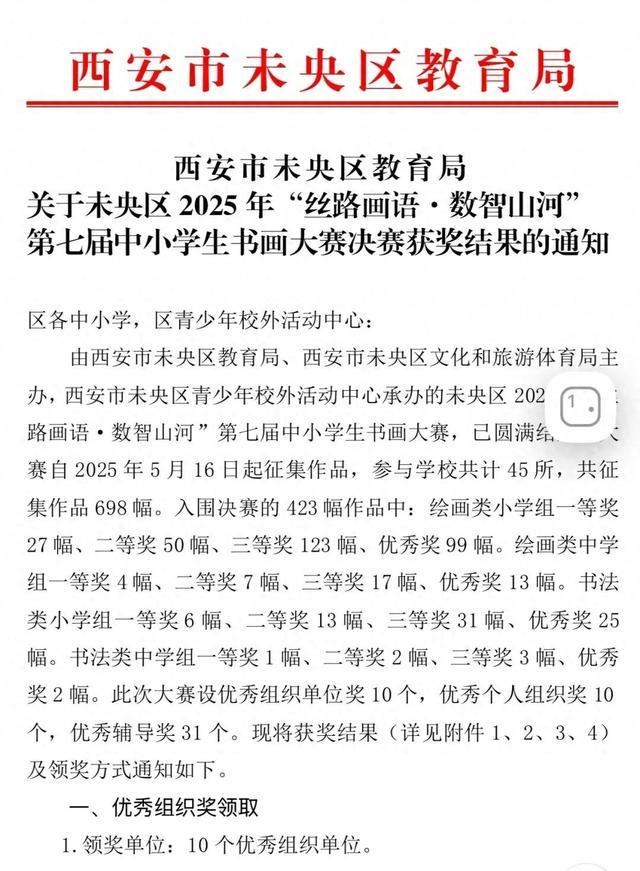 近日,由西安市未央区教育局、区文化和旅游体育局联合主办的2025年“丝路画语·数智山河”第七届中小学生书画大赛圆满落幕。本次大赛以“传承中华文化,探索艺术与科技的融合”为宗旨,为全区中小学生搭建了展示艺术才华与创新思维的优质平台,西安市未央区西航三校24名学子在美术组教师团队的精心辅导下,凭借兼具传统底蕴与科技感的优秀作品斩获多项荣誉。