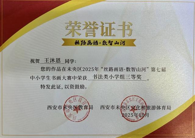 书法类作品中,同学们以笔墨为媒,将传统书法精髓与当代审美意趣相融,尽显汉字文化魅力。其中,王沐恩、王雨萱、杜何牧轩、杨悦妍同学荣获书法类小学组三等奖;任玺睿同学荣获书法类小学组优秀奖。