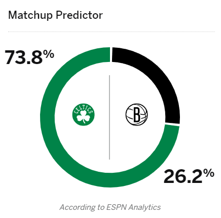 赛前,美媒ESPN预测本场比赛,凯尔特人胜率高达73.8%,篮网胜率为26.2%。