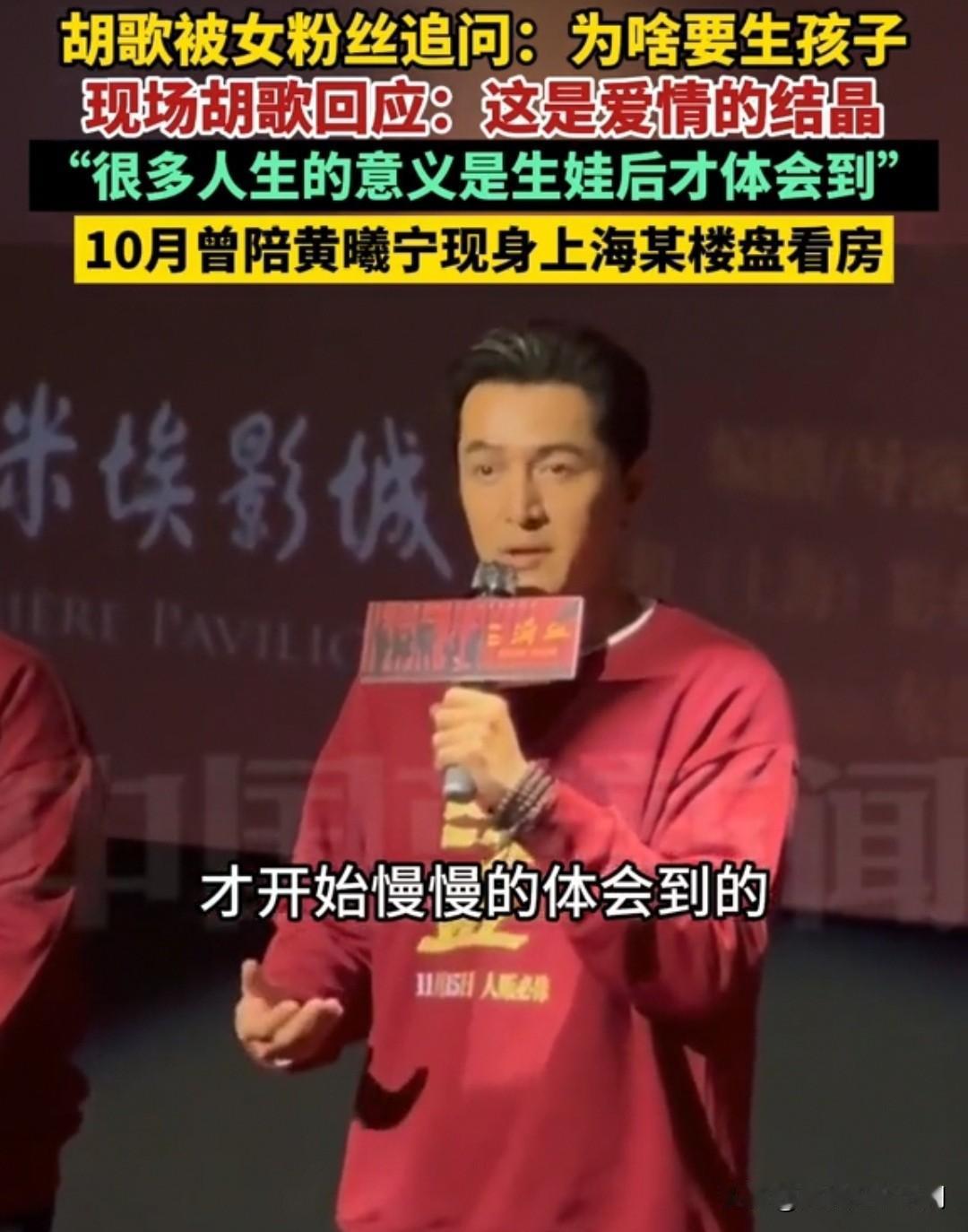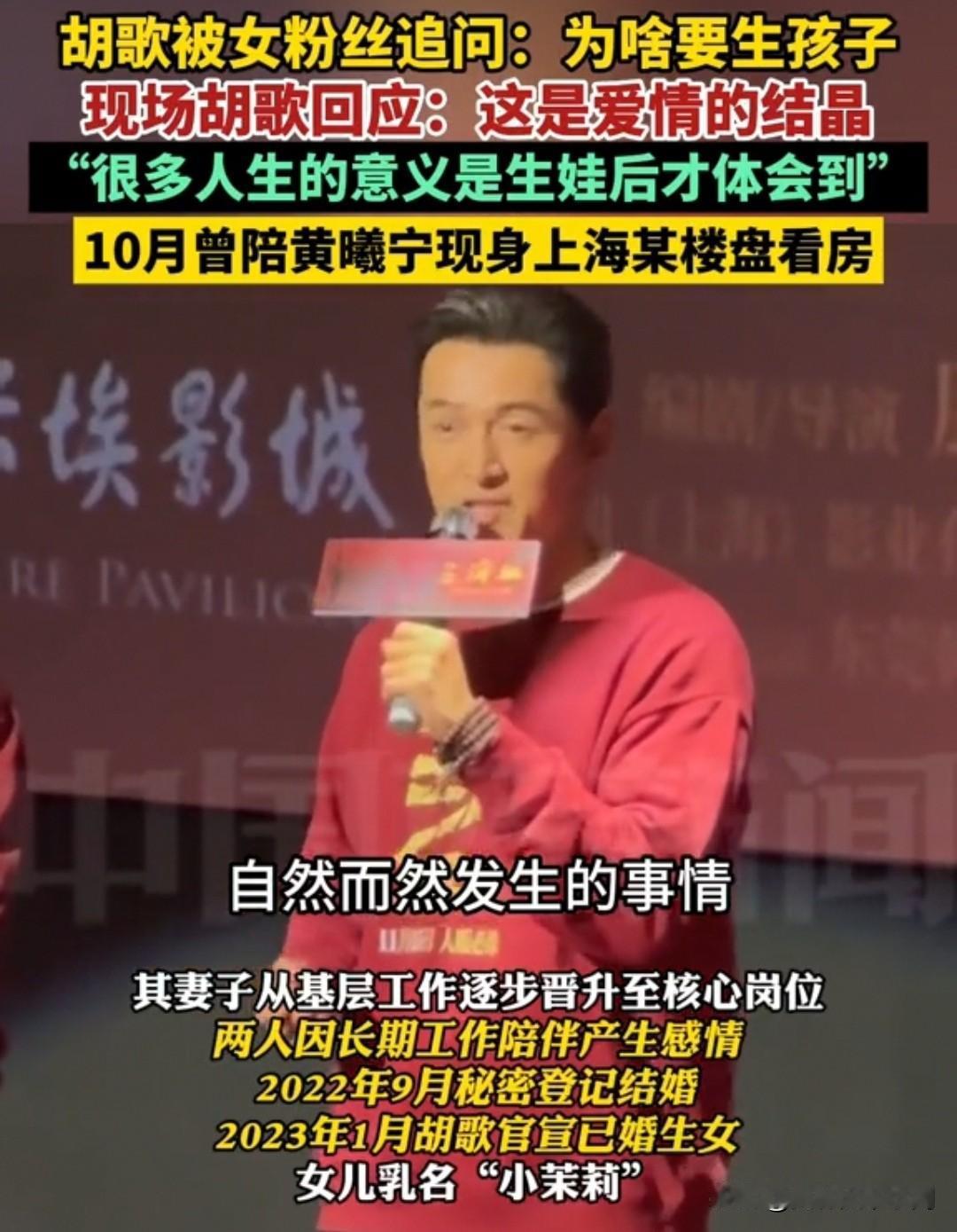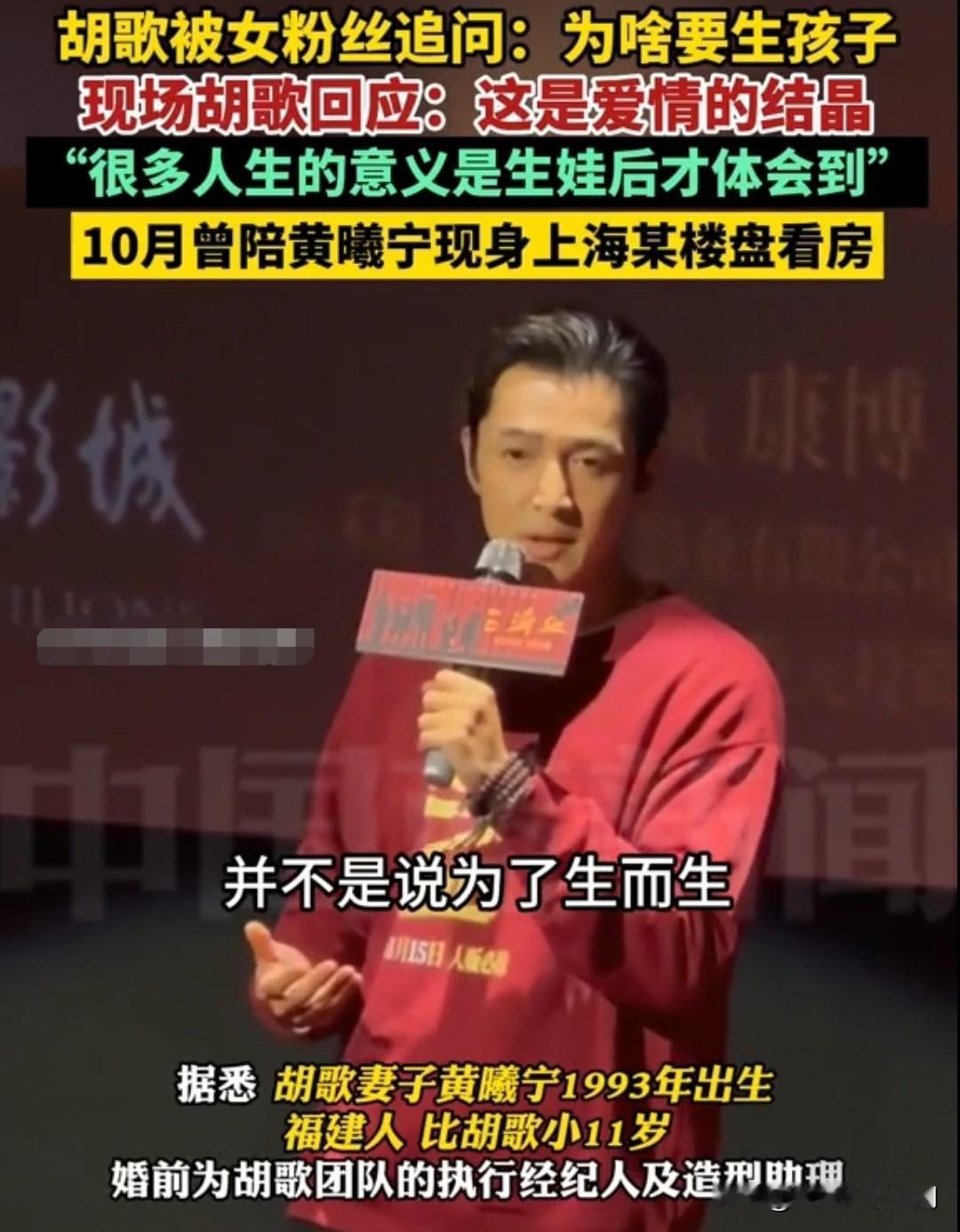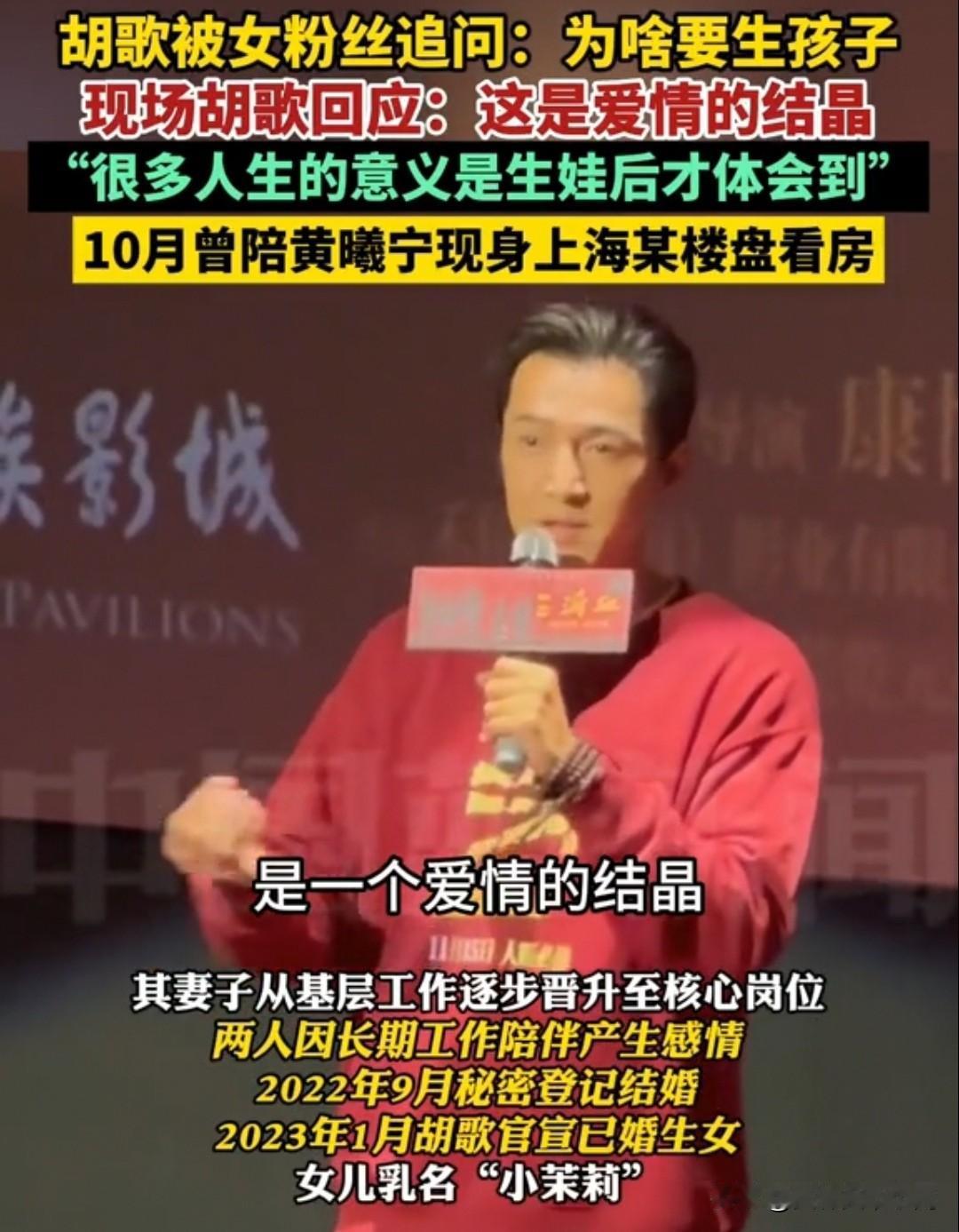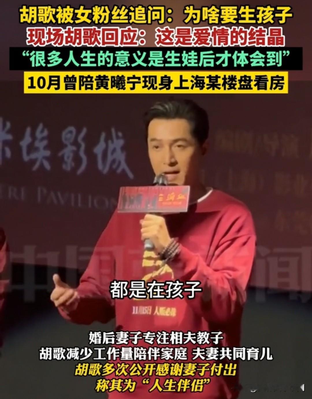 胡歌被女粉丝追问:“为什么要生孩子”,胡歌回应:“这是是爱情的结晶”[赞][赞][赞]没错,人生的很多意义和感悟是有了孩子开始的,我觉得孩子是过来渡我们的,让我们成为更真实,更好的人[耶][耶][耶]说得不错,我有了孩子后懂了很多以前不懂的事。[比心][比心][比心]顺其自然的事情,有一个孩子才会觉得人生是完美的,没白来[呲牙][呲牙][呲牙]我特别开心,他能结婚生子,而且从他娶的老婆来看,胡歌不是那种俗气的男人,是真的重视婚姻的。 他没孩子的时候,我总觉得他有点抑郁的,现在我觉得他充满了希望[大笑][大笑][大笑]