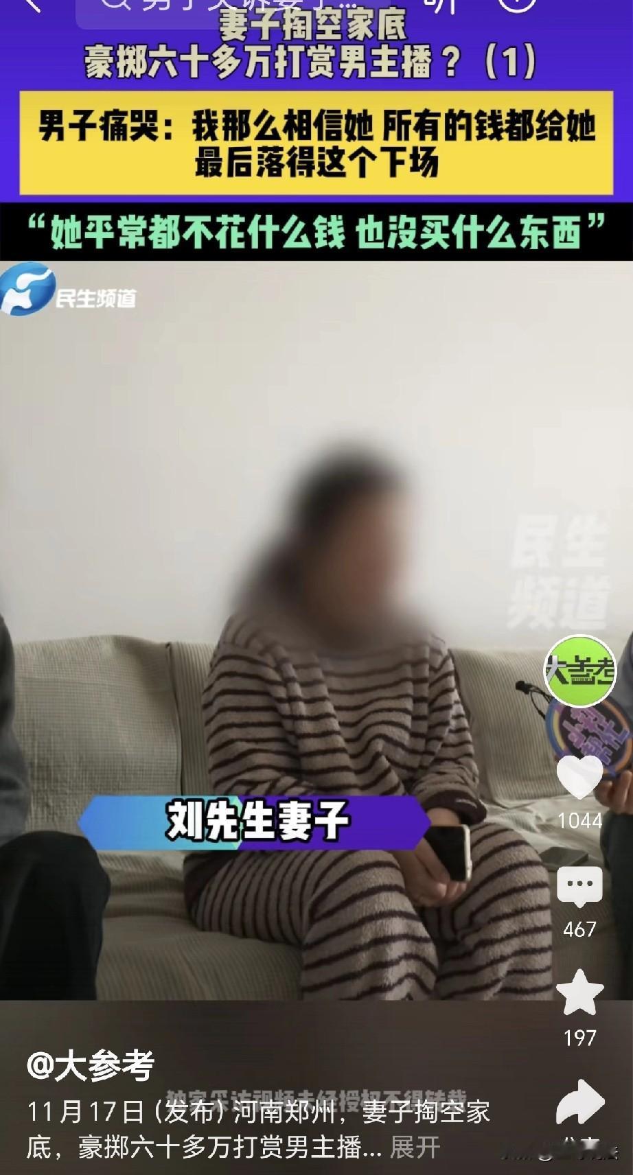 天都塌了!河南郑州,一男子结婚8年,省吃俭用存了116万,他交给妻子保管,谁知查账时发现,妻子账上只有3毛钱,男子这才知道,67万被妻子打赏给了男主播,其余的钱,妻子支支吾吾说不清楚,男子还发现,不但积蓄没了,妻子还借了80000万元网贷,妻子: 他叫我宝宝,忍不住上头了,男子大哭: 我那么相信她,钱都给了她,却落得这样下场… 刘先生30多岁,他铮铮铁骨,一个魁梧高大的男子,却在记者镜头面前委屈的落泪。 他在外拼搏,省吃俭用,8年时间,攒下了116万元,他全部交给了妻子保管,可谁知却遭到了背刺,妻子拿着钱去打赏了男主播。 如今妻子账户上一分钱没有,还欠了80000元的网贷,刘先生8年的辛苦,被她毁之一炬。 原来,刘先生是个有责任心的男子,他8年前和妻子结婚,婚后不久,妻子为他生下了孩子。 因为照顾孩子,妻子不能再出去工作,全家人的生计,全部都由刘先生扛着。 刘先生为了多挣些钱,他常年在外地奔波,他住着每月300租金的房子,冬天漏风,夏天漏雨,其中的艰辛只有他自己知道。 尽管他如此的辛苦,可是只要想起来妻子孩子,再苦再累,他心里也是甜滋滋的。 转眼间孩子上学,他体贴妻子在家的不容易,他省吃俭用,把自己的生活支出压缩到了极致。 每次发了工资,他就把挣来的钱交给妻子,妻子收到钱后,眉开眼笑,她认为理所当然,因为刘先生是自己的男人。 刘先生望着妻子,他满心的怜惜,她在家带孩子不易,钱放妻子手里,她就能安心的抚养孩子。 八年下来,刘先生攒下了116万,全部存在妻子的账户里,他想着供孩子上学,还要考虑老人的赡养问题。 谁知他突然发现,妻子对他不冷不淡,拿着手机,整天刷着直播观看。 直播间里男主播载歌载舞,卖力的在屏幕上表演着各种节目。 妻子看的如痴如醉,不停的给男主播打赏,就是为了当男主播的榜一大姐。 刘先生顿时心里吃惊,赶忙要查妻子的账户,谁知妻子支支吾吾,各种各样的理由搪塞了过去。 这样的次数一多,刘先生心里犯了嘀咕,他觉得妻子好像不太对劲,以前妻子并不是这样。 他忍无可忍,再三的逼问下,妻子看隐瞒不住,这才向刘先生说出了实情。 妻子告诉他说,家里的钱已经没了,刘先生懵圈,以为妻子和他在开玩笑。 116万元不是小数目,日常用度咋也不能够花干花净,更不可能说没就没,即便是没了,也得有个去处! 直到妻子坦白,他才知道,这些年他省吃俭用攒下的血汗钱,有67万都打赏给了男主播。 剩下的钱妻子不说,再问也不吭声,到了最后,刘先生发现,妻子的账户上只有0.3元,不但116万积蓄全都没了,妻子还借下80000元网贷,也是用来给主播刷礼物的。 刘先生脑子一片空白,突然感觉天都塌了,这些年的辛苦付之东流,自己对妻子的爱惜全都成了个笑话! 他就想不通了,自己在外头受多大罪都心甘情愿,就想让家里人过得好点,可妻子怎么能把这么多钱给一个素不相识的外人? 他追问妻子是不是跟主播见过面,有没有不正当的关系,妻子一个劲摇头,说从来没见过,就是看直播的时候上头了。 妻子说,她每天在家带孩子,闲下来就喜欢看那个男主播的直播。 主播还给她发来消息,叫她宝宝,说想宝宝一直陪着我,每次直播PK的时候,就喊粉丝帮忙拉票。 她看着主播说谢谢宝宝,就觉得心里十分的舒坦,她就忍不住想刷礼物支持。 一开始她是几十块、几百块的刷,到了后来,她就越刷越多,手底下一划拉,丈夫的血汗钱就这么没了。 她停不下来,一天不看男主播就难受,看着男主播PK就想帮他赢。 妻子低着头说,后来存款花光,她看着账户上空空,又忍不住借了网贷80000元…… 刘先生气得浑身发抖,他拿着手机给记者看,妻子的转账记录里,一笔笔都是给主播的打赏。 刘先生泪流满面,我那么相信她,把所有的希望都寄托在她身上,她却把我的血汗钱都给了别的男人。 刘先生抹着眼泪,家里上有老下有小,老人要吃药,孩子要上学,现在不仅没了积蓄,还欠了外债,日子该怎么过? 他对这段婚姻已经没了信任,就想把打赏出去的钱追回来,再跟妻子谈离婚的事。 之后,刘先生联系了直播平台,客服说需要上传相关资料才能核实。 他也找了记者帮忙,可心里没底,不知道这些钱还能不能要回来。 《民法典》第1066条规定: 婚姻关系存续期间,有下列情形之一的,夫妻一方可以向法院请求分割共同财产:(一)一方有隐藏、转移、变卖、毁损、挥霍夫妻共同财产或者伪造夫妻共同债务等严重损害夫妻共同财产利益的行为。 针对已打赏的67万元,刘先生可作为利害关系人,起诉请求确认赠与行为无效,要求主播返还实际获得的打赏款项。 妻子所借的8万元网贷,刘先生并不知情,事后也未追认,也没用于家庭支出。因此,该8万元网贷应由妻子个人独立清偿,刘先生不承担连带还款责任。 关注@王哥说法 多学法律少吃亏!