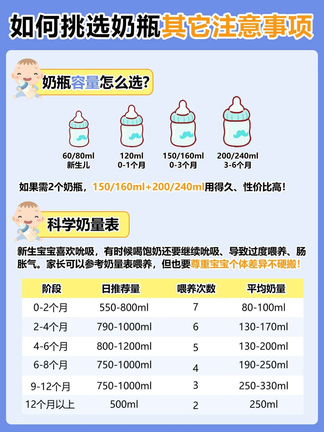 奶瓶容量怎么选?需结合不同月龄的奶量选: