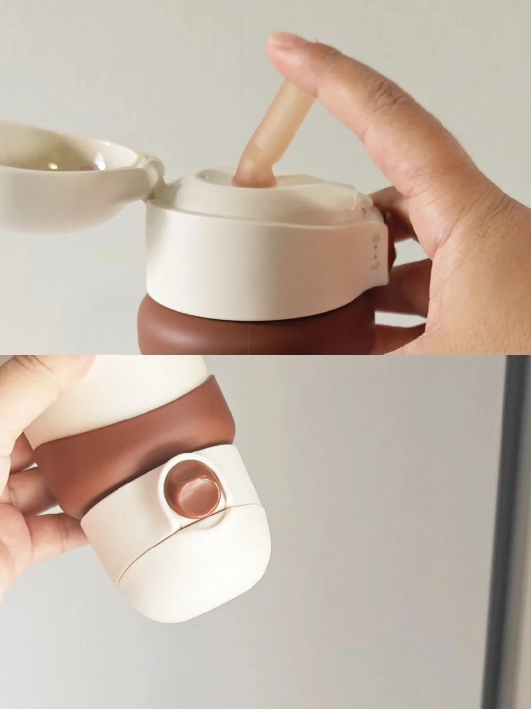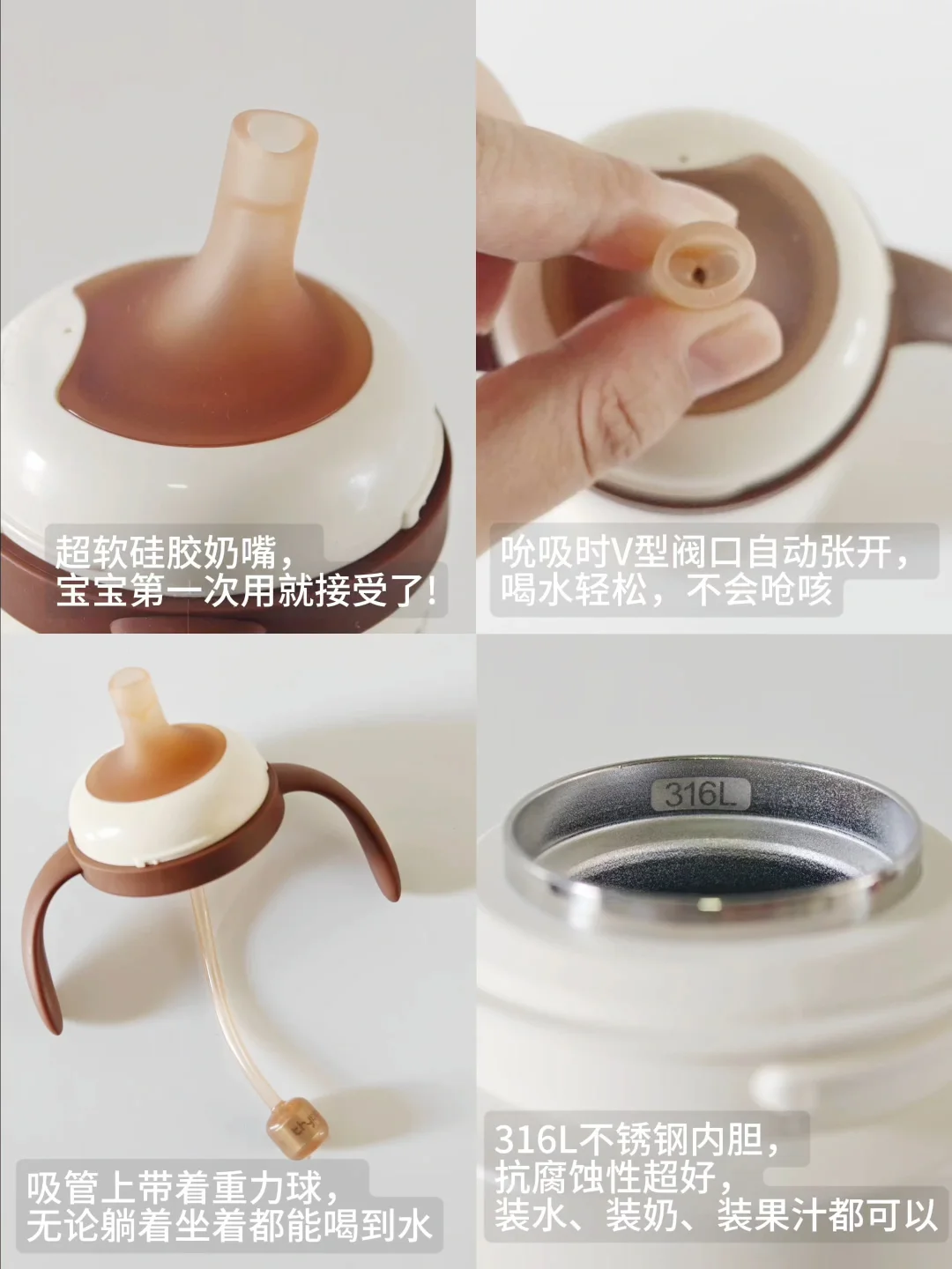 这款适合 18 个月以上的宝宝用。它的吸管口去掉了 V 型阀,娃喝水更顺畅,能大口大口喝,刚好满足他活动量大时的喝水需求。而且保温效果真的太感人了,装进去的温水,10 小时后还是温温的,哪怕在外跑一整天,也不用担心娃喝不上温水,简直是带娃出行的 “神器”!