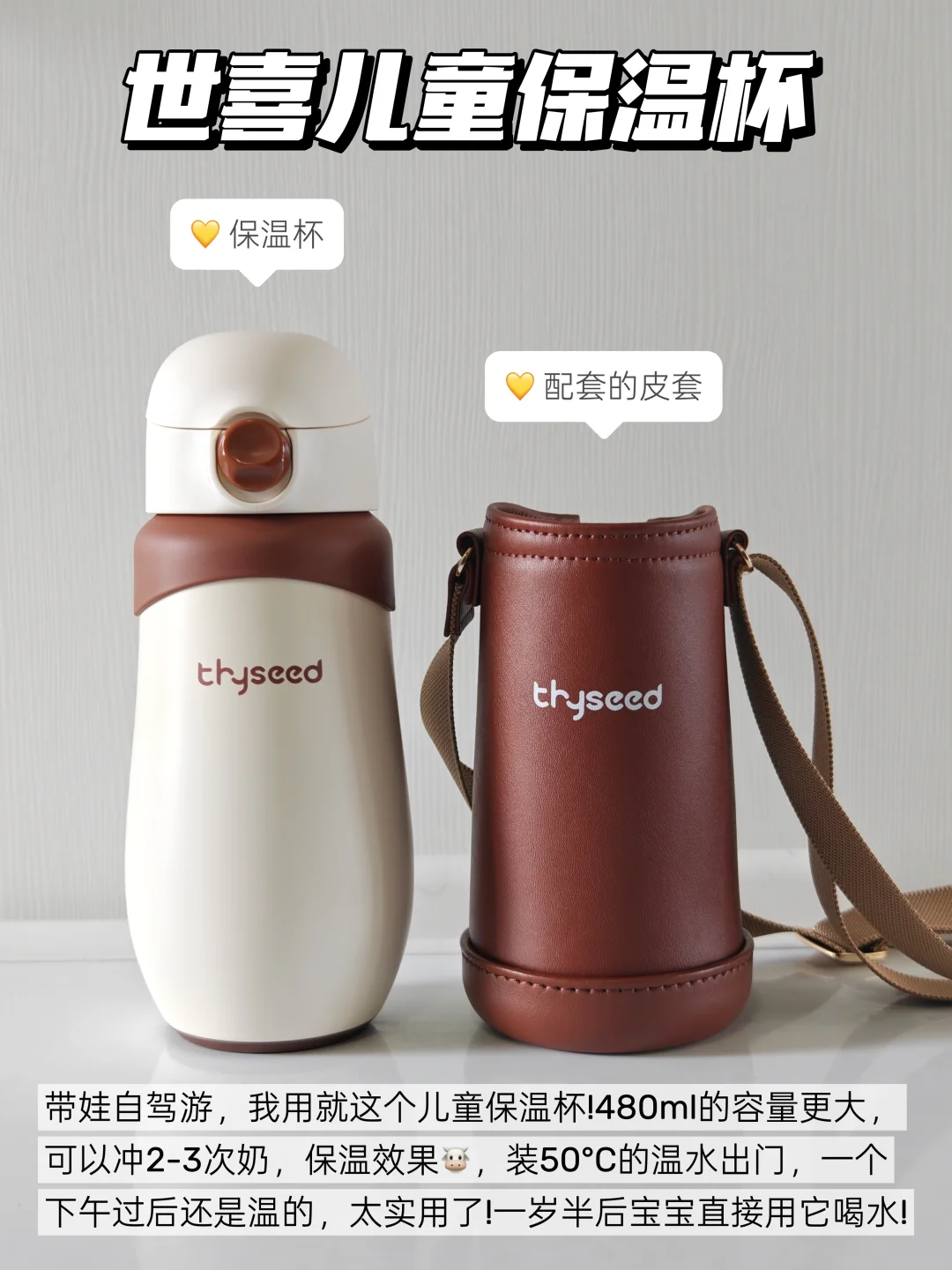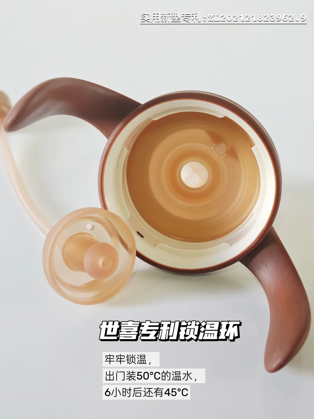 这俩杯子可是我家娃用了 2 年的 “老功臣”,颜值高到出门被好多宝妈追问,而且还带世喜专利锁温环,出门装 50°C 的温水,6 小时后还有 45°C,这保温效果简直绝了,实用度直接拉满💯(实用新型专利:ZL202121823962.9)