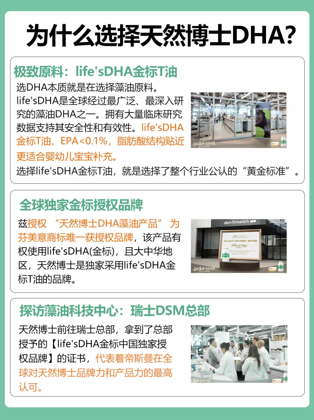 谁没为娃补DHA交过“智商税”? 补多怕伤体,不补怕耽误🧠👀成长,查资料越查越乱! 作为啃透市面上大部分资料的学霸宝妈,今天用保姆级攻略帮你避坑 揭秘我对比10+款后,放心给小布丁吃的天然博士小琥珀DHA有多香~ - 首先原料很抗打,用的是life'sDHA金标T油 油脂很纯粹几乎不含EPA,且脂肪酸结构贴近母乳 对于0-3岁低龄宝宝来说,很好吸收 而且,天然博士是全球独家金标授权的品牌 DHA选天然博士, 吃的是其他DHA没有的高品质! - 其次配料很干净,夹心纯藻油 不含其他不需要的油脂,所以颗颗天然琥珀色 也没有人工香精、人工色素、蔗糖、防腐剂等等添加剂 还通过了55项过敏原检测,敏宝也能放心吃! 一天一颗,补足100mg金标DHA - 天然博士还是透明工厂出品 生产过程透明化,品控严格,给娃吃超安心 给娃补了快一年, 体检被夸,各方面表现都很不错! 宝妈们还在纠结DHA的, 真心推荐天然博士小琥珀DHA 抓住孩子成长黄金期,盘它没错!