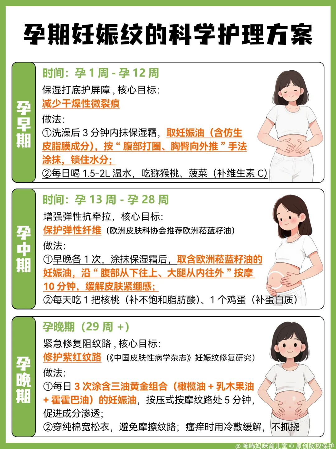 ✅孕早期(1-12 周)是皮肤防护关键期,按皮肤科逻辑,用含仿生皮脂膜成分的妊娠油做好保湿。此阶段皮肤易干燥,缺水会降低弹性,仿生皮脂膜能锁水,减少干燥引发的微小裂痕,为抗纹打基础。我每天洗澡 3 分钟内涂保湿霜 + 妊娠油,皮肤始终水润。