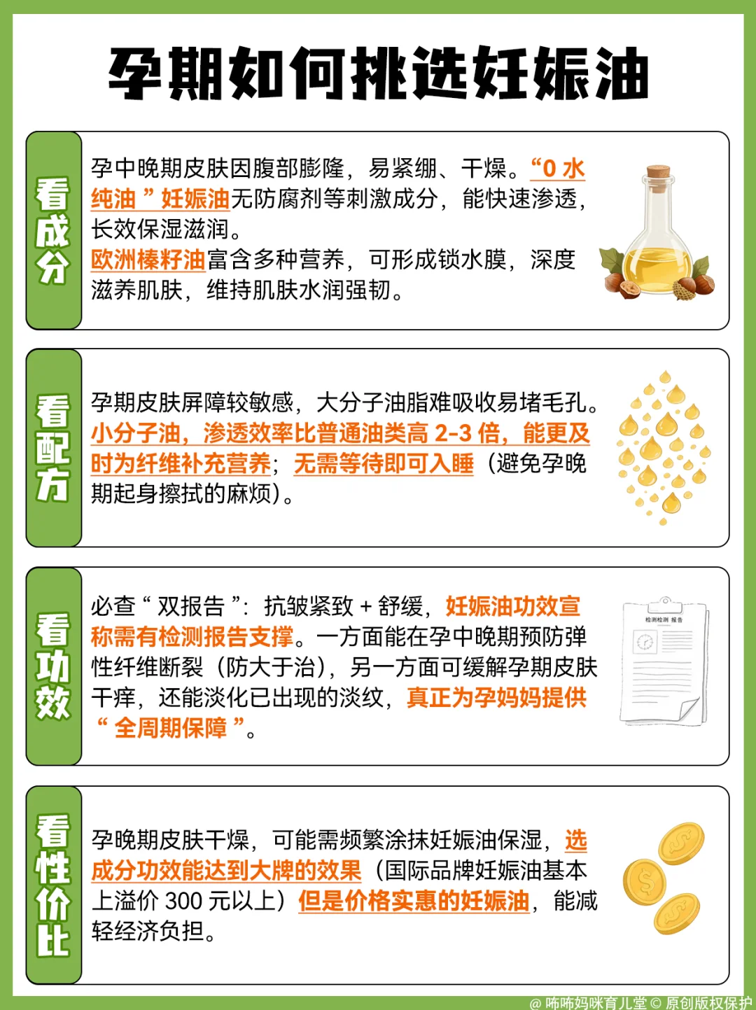 ✅孕中期(13-28 周)胎儿快速发育,腹部皮肤被撑开,重点要保护皮肤弹性纤维。研究显示欧洲榛籽油含丰富不饱和脂肪酸,增强皮肤弹性,我选的妊娠油就含该成分,每天早晚各涂一次保湿霜 + 护理油,到 28 周肚子虽大但皮肤无紧绷感。