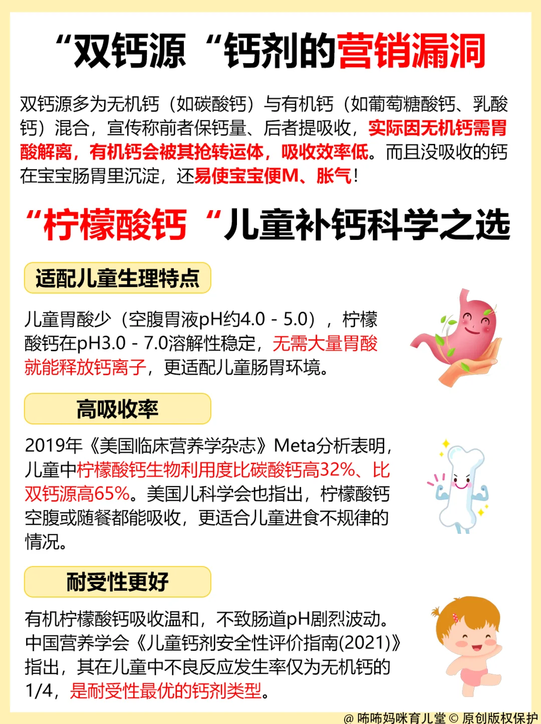 👶🏻宝宝肠胃娇嫩,空腹时胃液 pH 值 4.0-5.0,胃酸分泌本来就少,无机钙在这种环境下很难溶解,吸收自然差,还容易给肠胃添负担❗