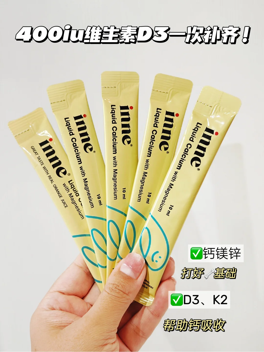 一条里有 200mg 钙,量给得恰到好处,对小宝宝来说既充足又不会过量,特别贴心。每条里还有 400IU D3,一次就能补齐,宝宝每天吃 1 包,不用再额外补 D3,配方考虑得太周全了!