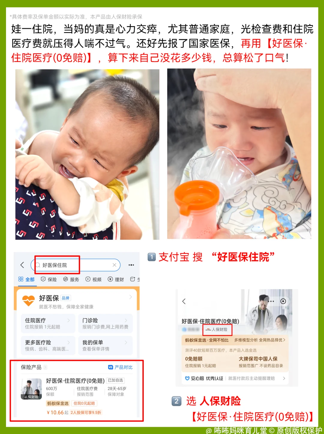 想要给宝宝多一点的保障的爸妈可以上支付宝搜“好医保住院”,点击人保财险承保的了解保障详情哦~
