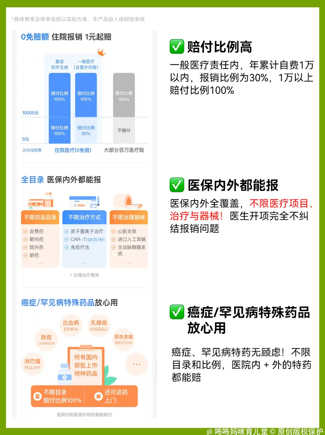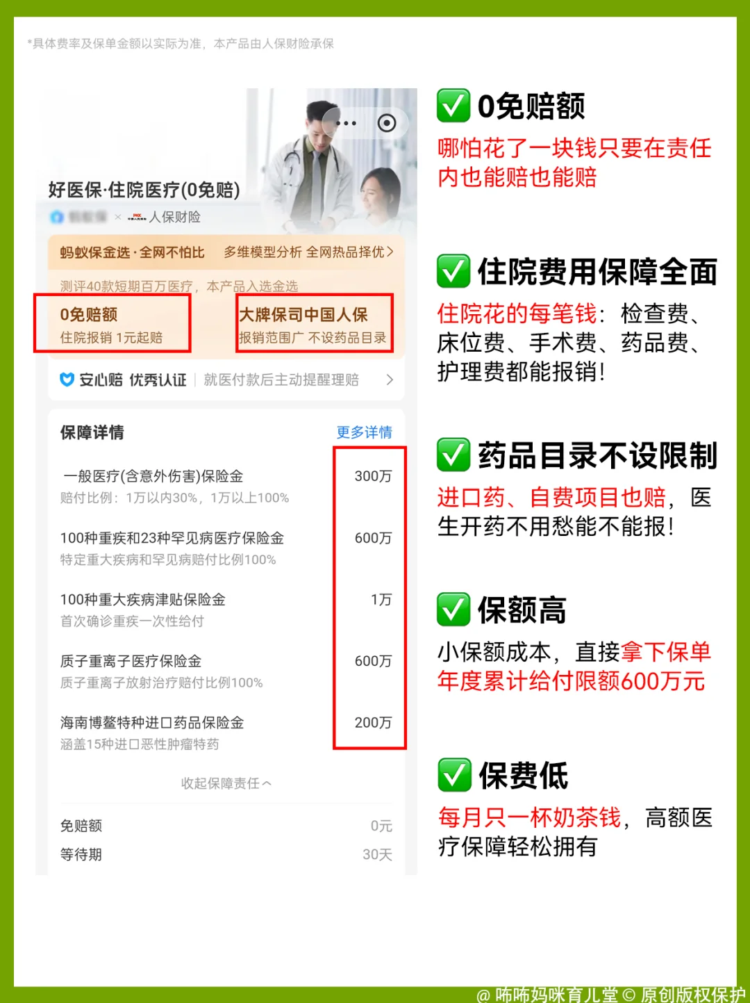 而它每个月只需要1杯奶茶钱!性价比太高了!且报销范围全,宝宝做的检查和药品费也包含在内。
