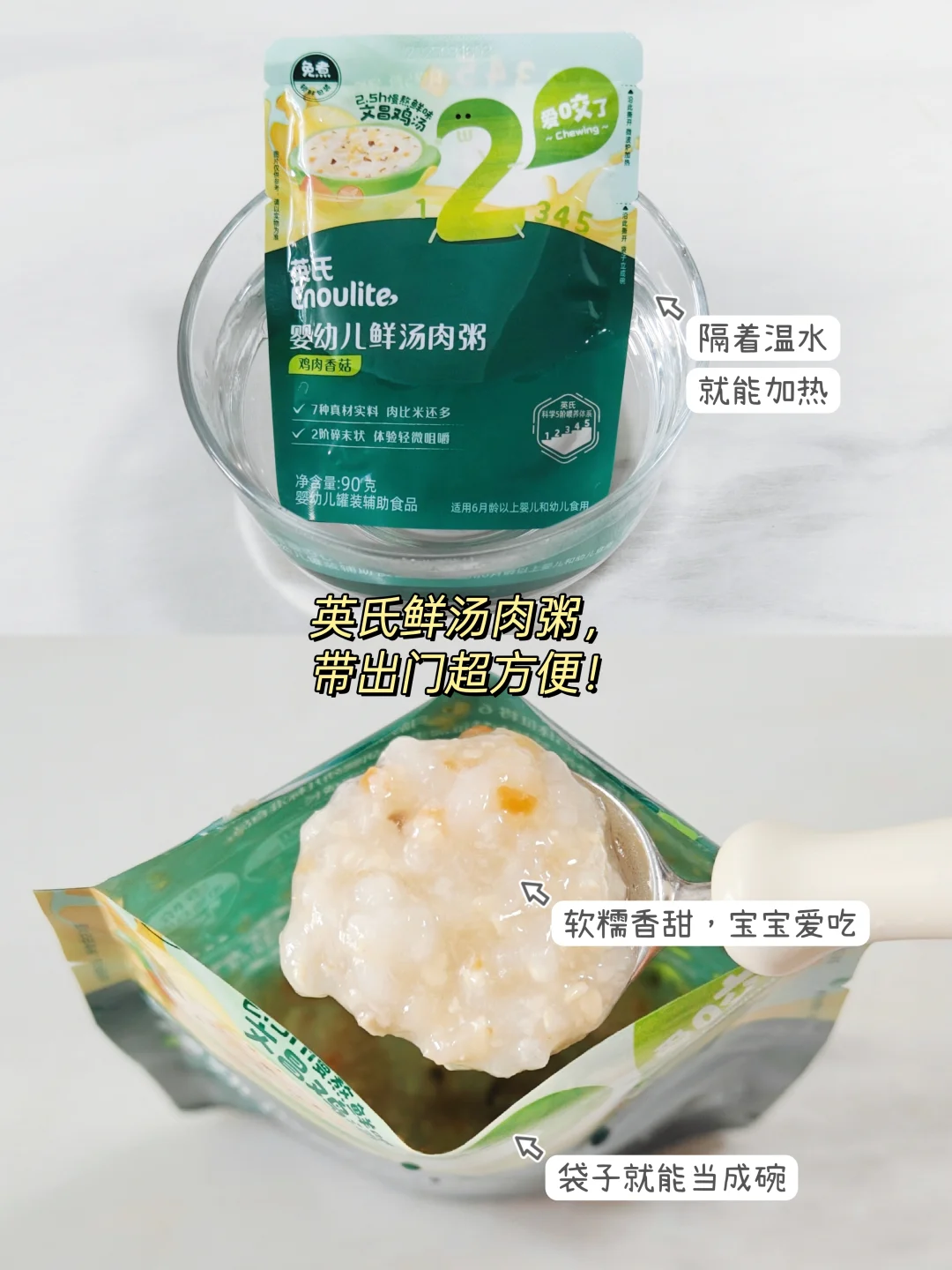 再带上一袋英氏鲜汤肉粥,撕开就是宝宝美味大餐,出门再也不要大包小包了~
