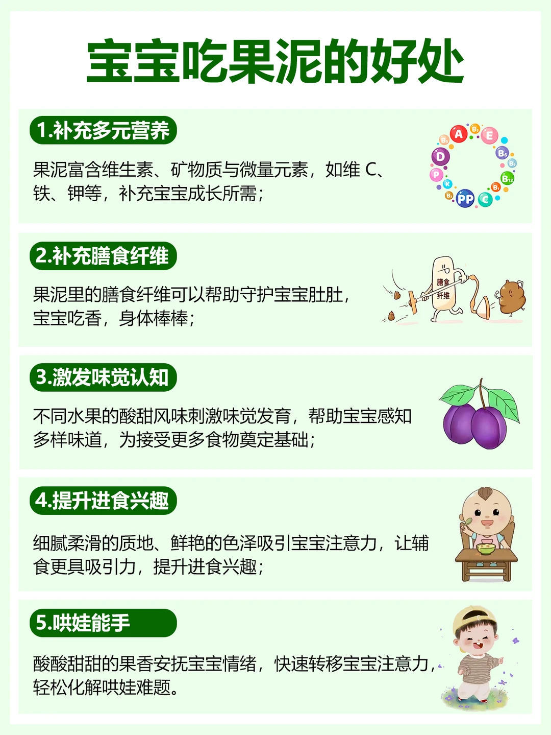 3⃣约10 - 12 个月,宝宝活泼爱爬,3 阶果泥4-5钟水果搭配,满足能量需求