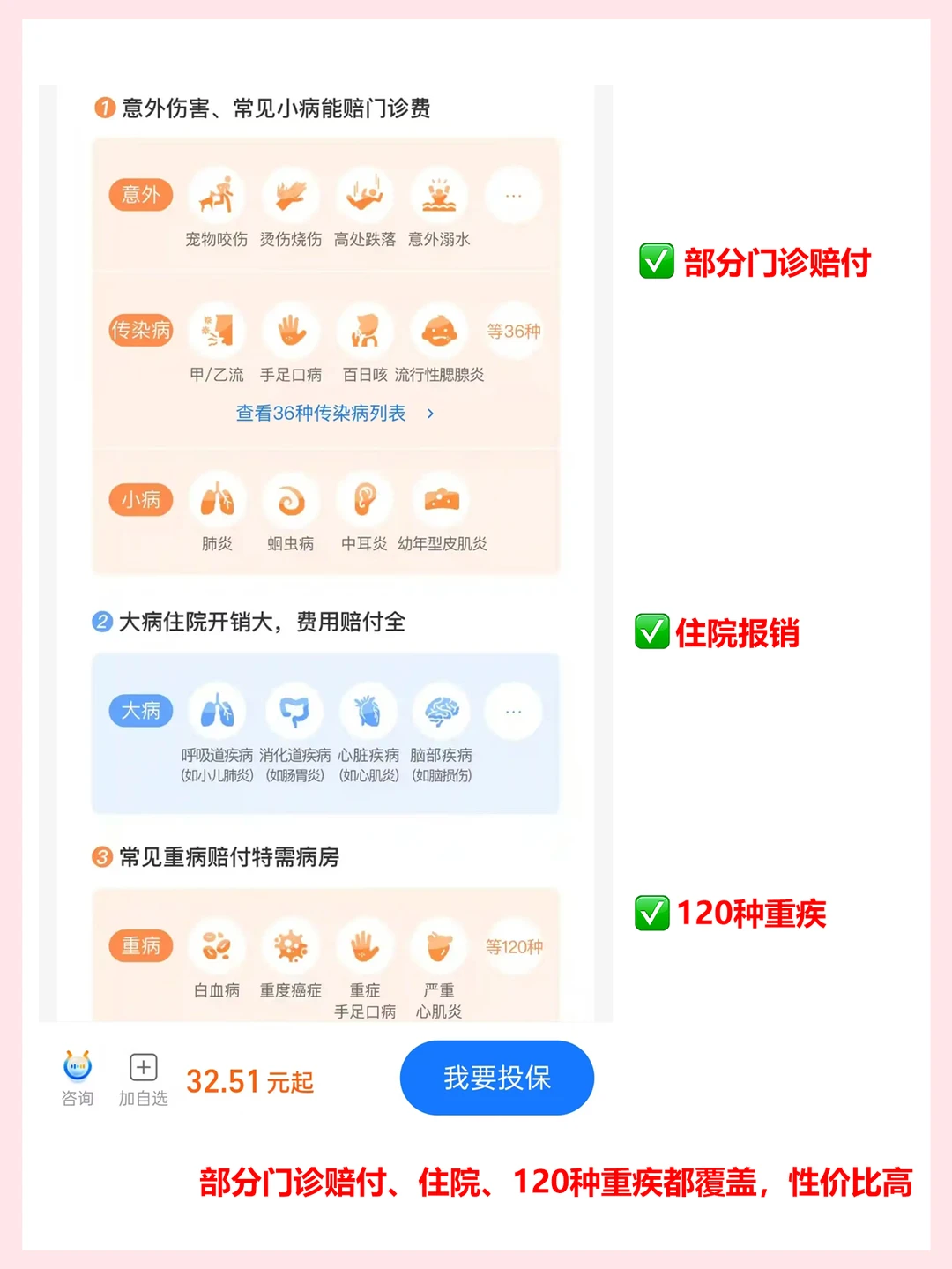 之前很多宝妈都认为流感和普通感冒没什么区别,但其实流感来势汹汹,并发症凶险,尤其需要警惕! . 🔸普通感冒症状轻,可能就是流点鼻涕、稍微咳嗽几声、低热,精神头还不错,可能几天到一周就好了。 ‼流感可不一样,发病特别急,高烧一下子能飙到39°C甚至更高,宝宝还会头痛、全身没力气,看着就心疼。而且流感并发症特别多,像肺炎、心肌炎,严重的还会危及生命。真的不能掉以轻心! . 😭含泪总结了的宝宝流感护理经验,请看图①-④,请收好! . 我家孩子之前得流感,高烧不退,退烧药喂下去不到2小时就烧起来,难受得一整夜哭,太心疼了!更可怕的是流感还没好,又染上支原体,咳得凌晨2点抱着他去急诊,各种检查、开药、雾化等,大几千又花进去了😿。虽然少儿医保能报销不少,但每次几百上千的叠加起来,是不小的数目,压力还是蛮大的! 之前我还傻乎乎的出钱,和早教班其他宝妈聊天才知道,人家都早早给娃买了少儿医疗险。想想也是,光有少儿医保可不够,🟢再添份少儿医疗险,关键时刻真能给家庭兜住底,减轻经济压力。 . 我马上做功课,对比好多款,最后给我家娃选了好医保·少儿长期医疗。💎蚂蚁保金选的产品,保障范围那叫一个广,责任内几乎常见的疾病都有保障,全国二级及以上公立医院都能用,妥妥的四合一综合医疗险,还0免赔额! . 💁像孩子容易得的甲乙流、肺炎等40种日常疾病,还有摔伤烫伤意外,去门急诊也能赔,赔付比例80%;住院1万以上部分按100%⽐例赔付;碰上白血病等120种少儿特定疾病,赔付比例直接拉满到100%,还可以享受二级及以上公立医院国际部、VIP部这些高端医疗服务、专家团队、VIP病房啥的。 . 医保报销后,责任内哪怕就1块钱,也能按比例报,没一点套路。三四线城市也能去北上广大医院看病,没这保险,哪有渠道和钱看这些。而且保证续保到19周岁,性价比超高! . 📌而且它还是税优健康险,保费能抵个税! 还没给娃配置少儿医疗的姐妹,抓紧上支付宝搜索“好医保少儿”安排上,买之前一定仔细看健康告知,给娃一份保障,咱当父母的也安心! *本产品由平安健康保险承保,具体费率及保单金额以实际为准