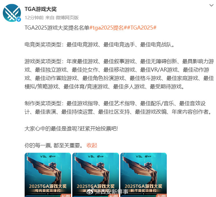 11月18日, 公布2025最终提名名单。电竞类奖项类型包括:最佳电竞游戏、最佳
