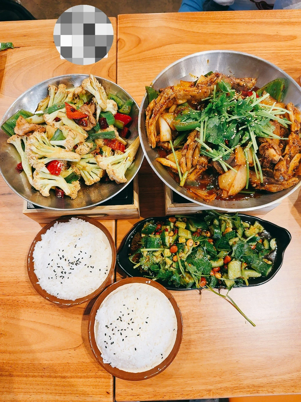 干锅套餐(图2)里包括干锅猪蹄鸭掌、一份蔬菜(我选的干锅菜花)和拍黄瓜,猪蹄鸭掌都炖的脱骨那种,很入味。干锅菜花脆脆的好好吃,拍黄瓜也很下饭
