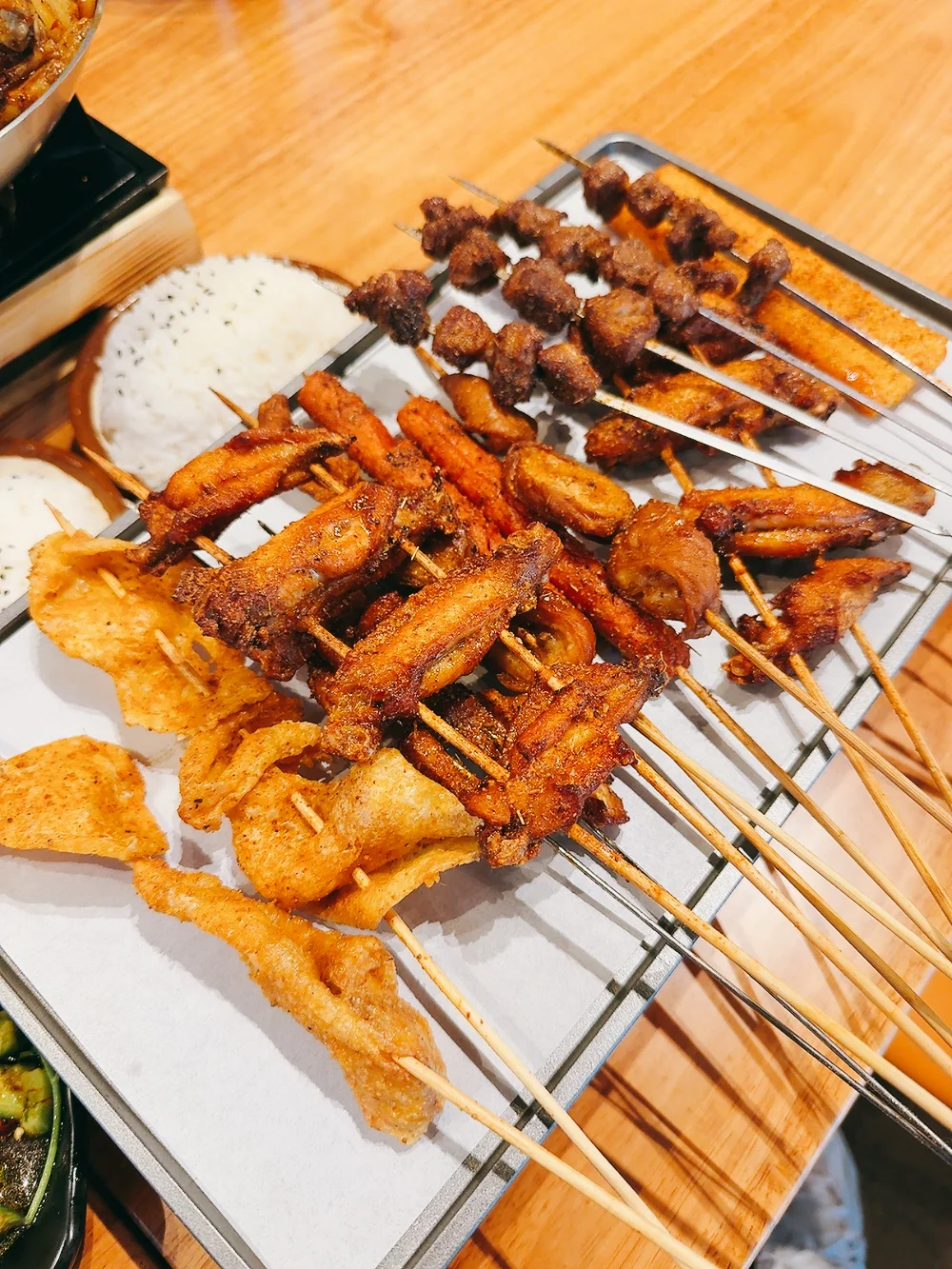 前几个月看到好多人分享湾区这家新开的烤串食堂,当时就很想去打卡,这几天看到他家出了工作日午餐special就赶紧冲了!我们点的双人干锅套餐,人均$20吃的超饱!有点震惊到我的是,一般火锅店才有的小料台这里居然免费,而且有鸡爪、虾片、水果、甜品,多吃点小料台都值了。店内很宽敞,带宝宝/放婴儿车都很方便